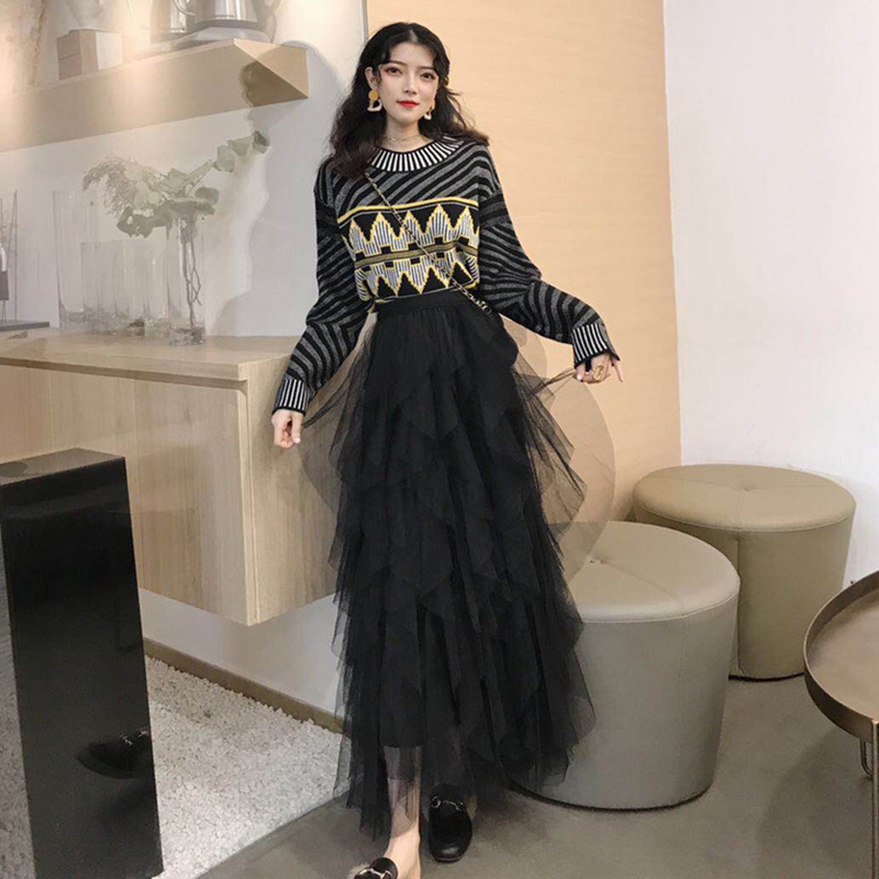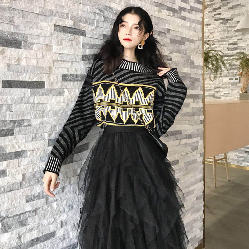 / 時尚套裝女秋冬新款慵懶風條紋毛衣針織外套高腰網紗A字半身裙子