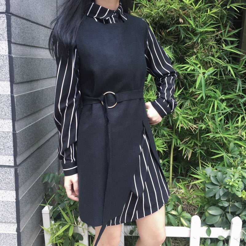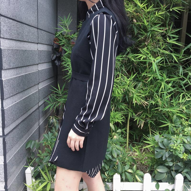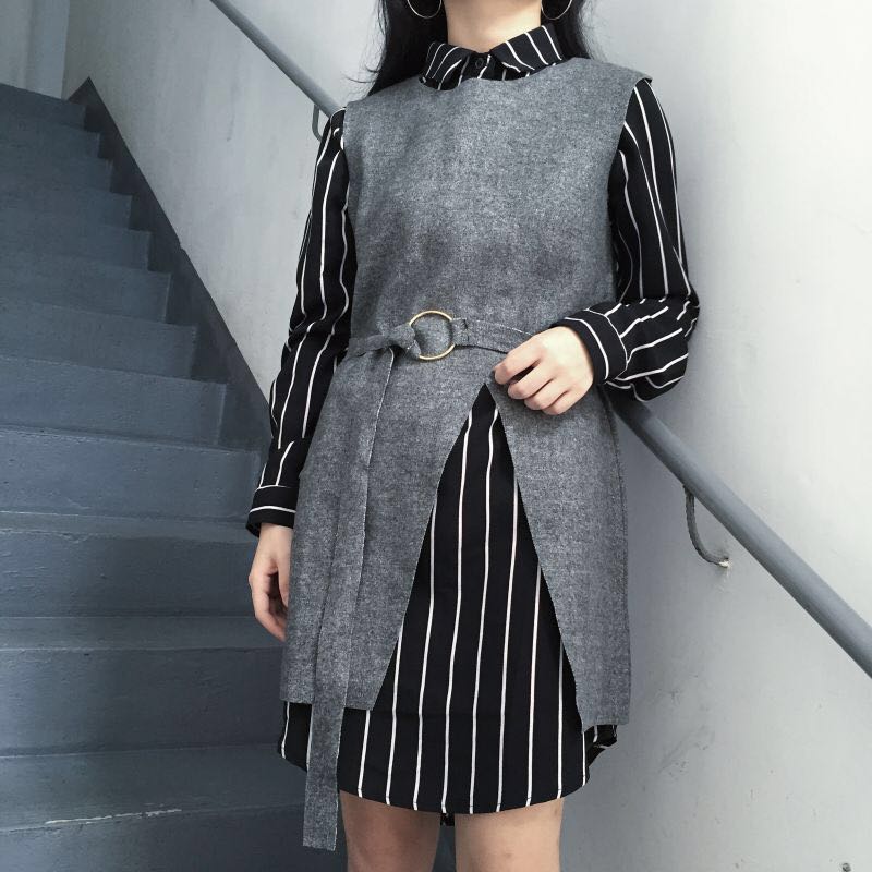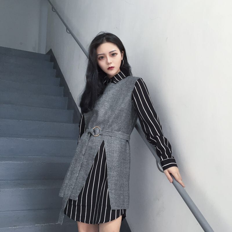/ 韓國chic秋冬款條紋寬松長袖襯衫中長款開叉毛呢背心連衣裙女