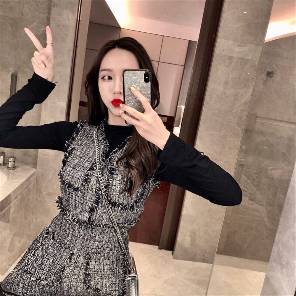 / 新款秋季名媛粗花格子兩件套連衣裙修身長袖打底衫T恤時尚套裝女