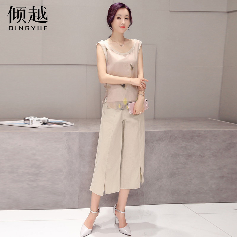 傾越春夏套裝2017新款女裝寬松雪紡上衣七分褲三件套韓版氣質百搭