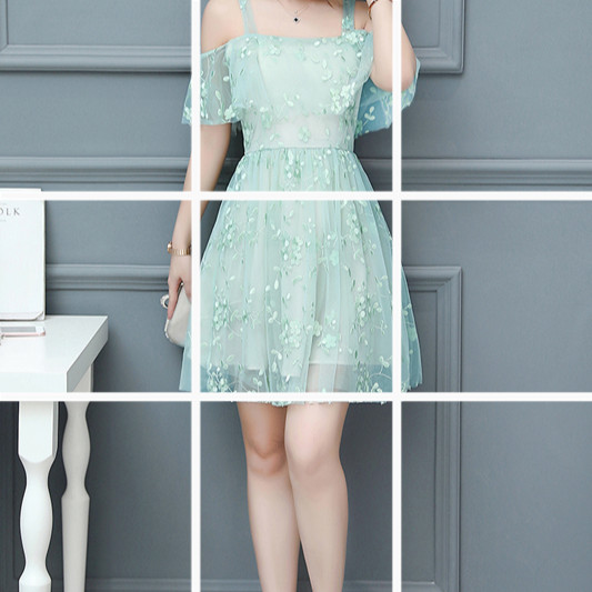 / 性感露肩吊帶裙款夏季小清新仙女蕾絲碎花雪紡連衣裙女中長款