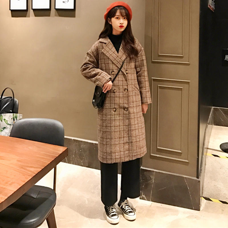 2018流行毛呢外套女秋冬裝新款赫本大衣小個子格紋風衣夾棉開衫潮
