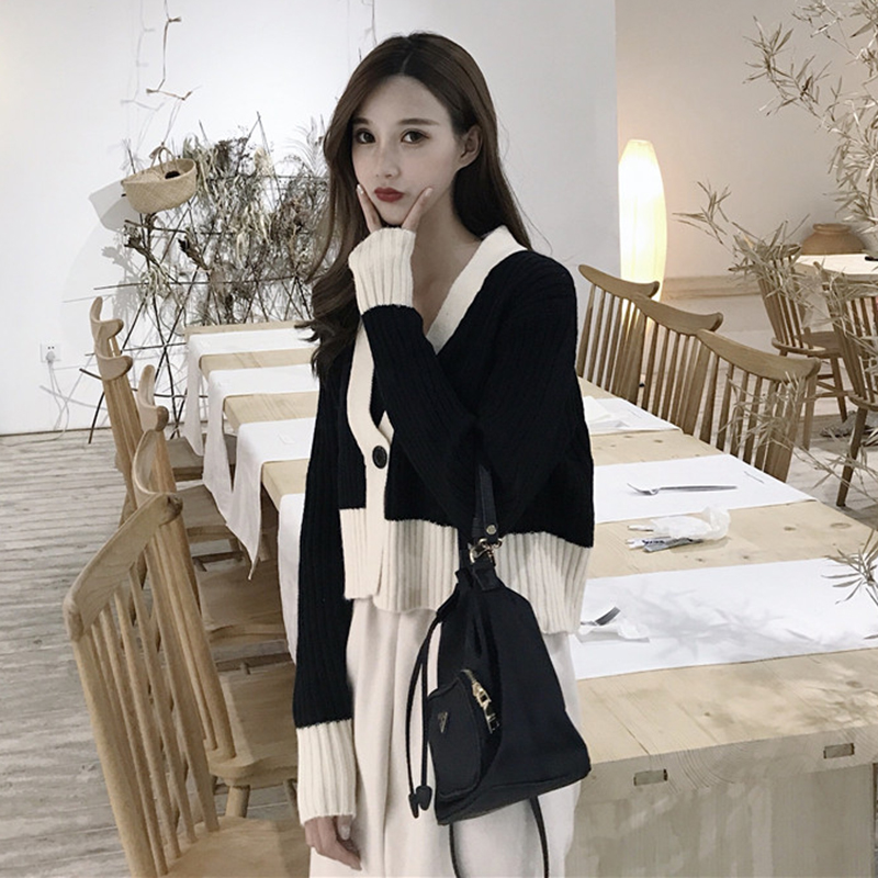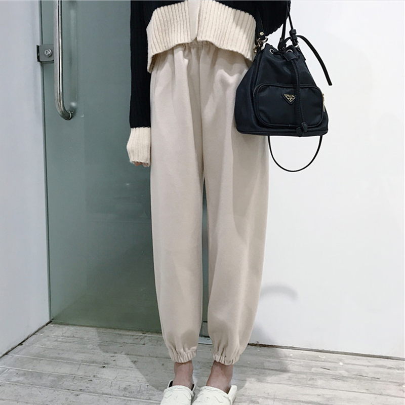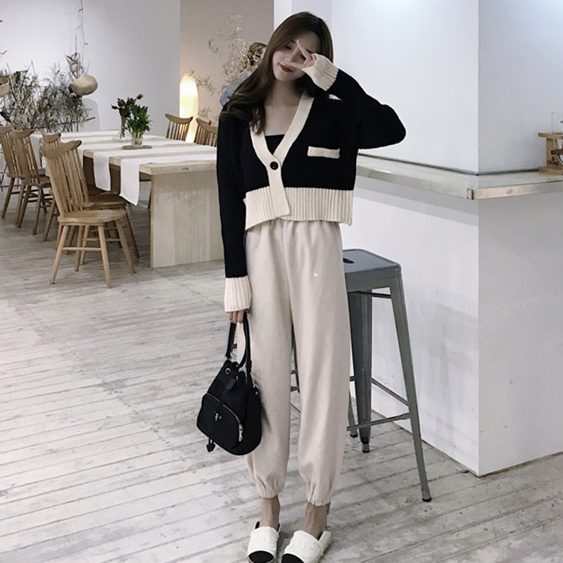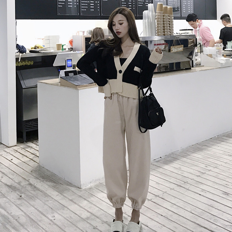 秋裝女2018新款拼色長袖針織開衫短外套高腰毛呢哈倫休閑褲子套裝