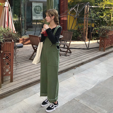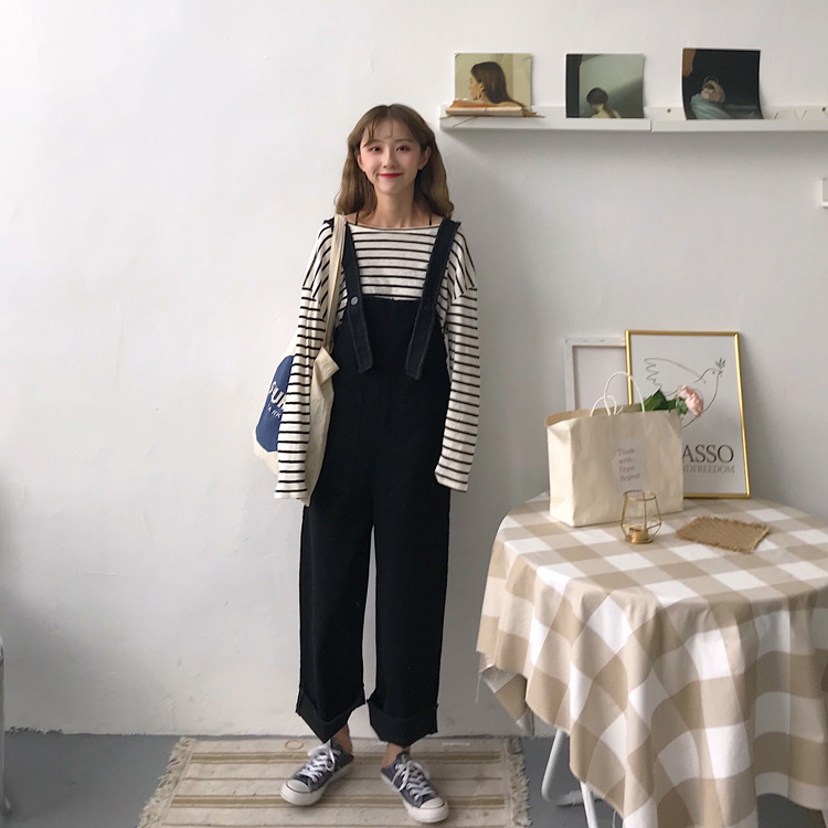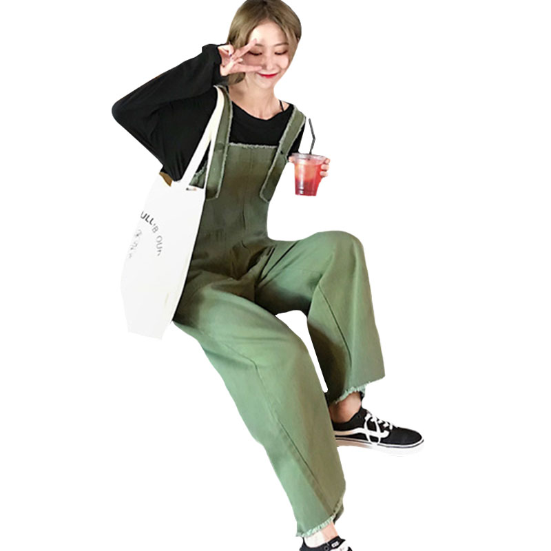 秋裝女裝韓版純色寬松顯瘦背帶褲連體褲毛邊高腰闊腿褲牛仔褲長褲