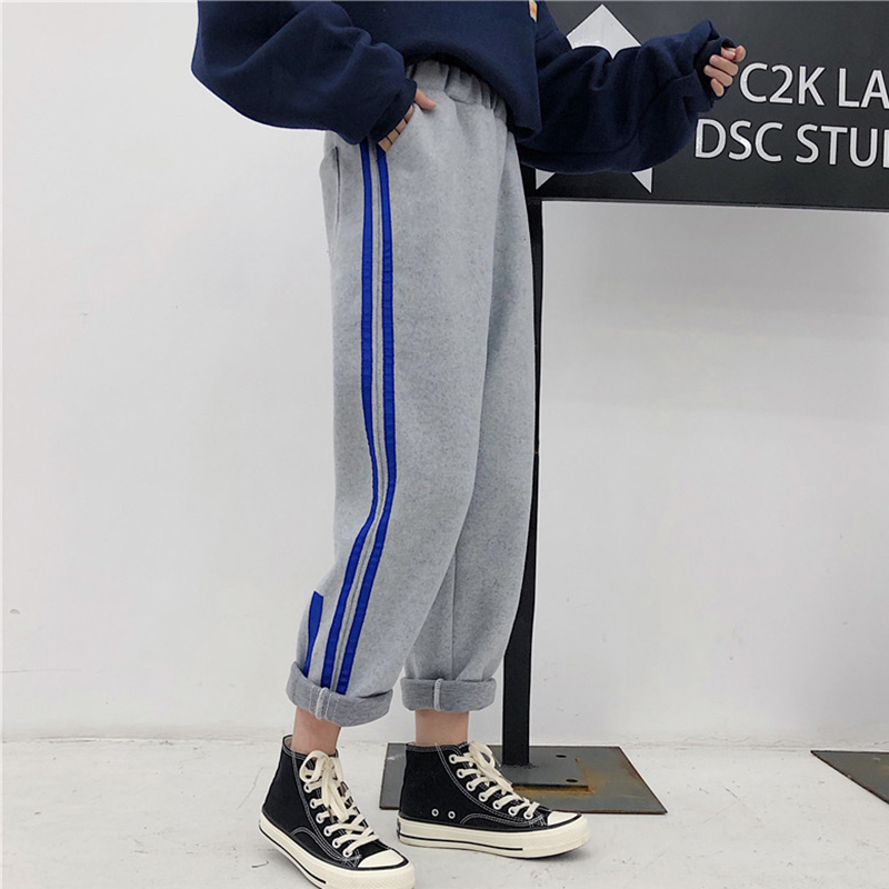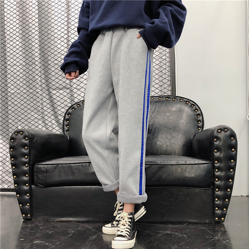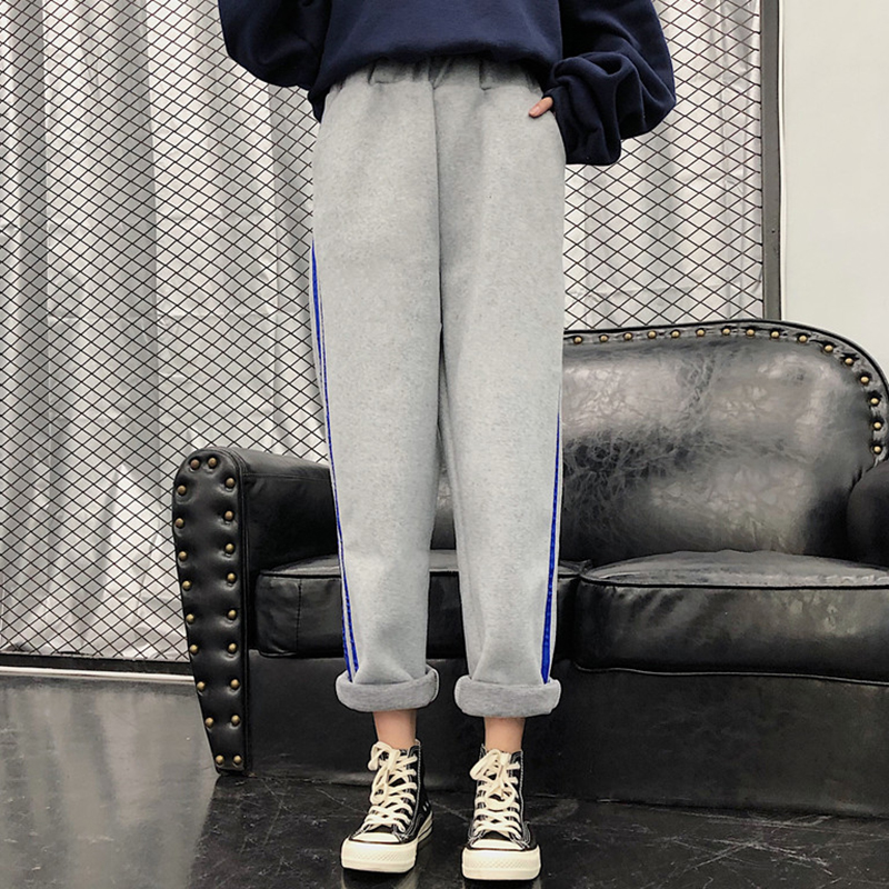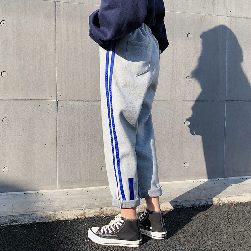 秋冬女裝2018新款韓版寬松條紋呢子休閑褲學生顯瘦直筒九分運動褲