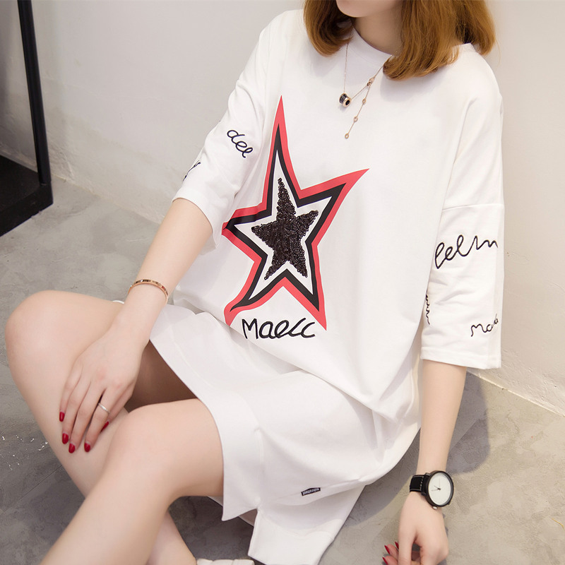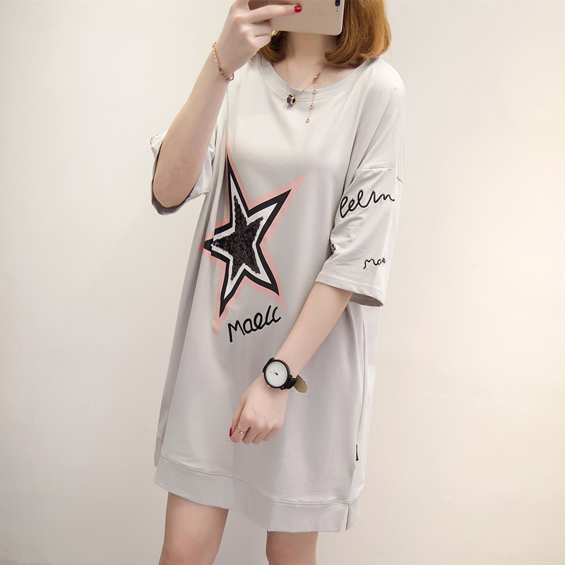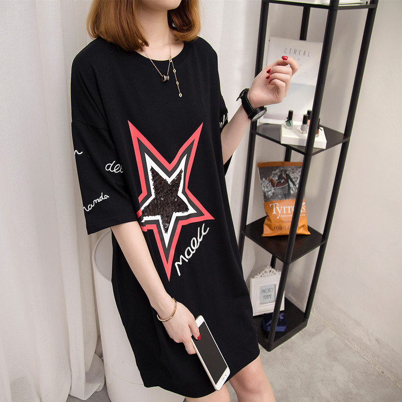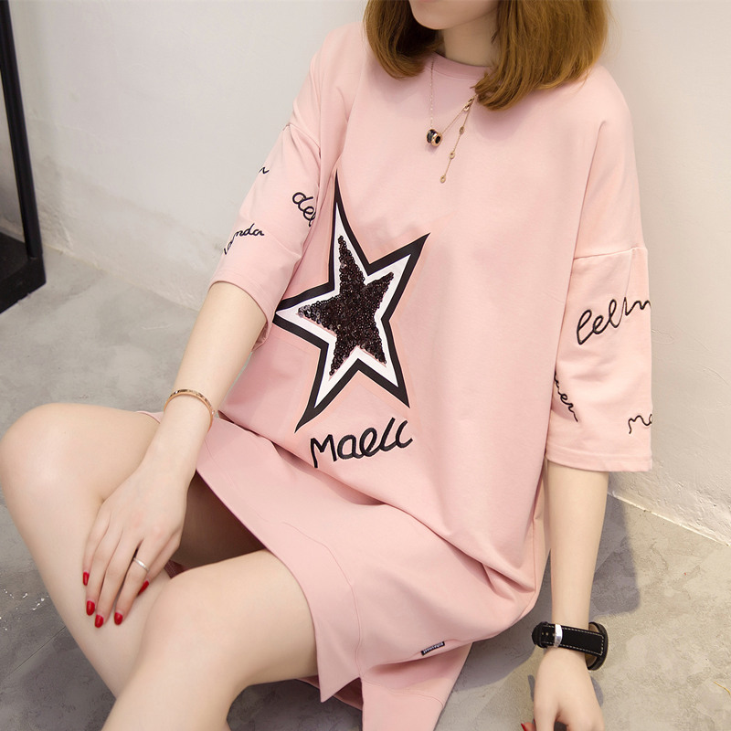 / 短袖t恤女寬松中長款韓版上衣女夏裝新款女裝亮片體恤百搭潮