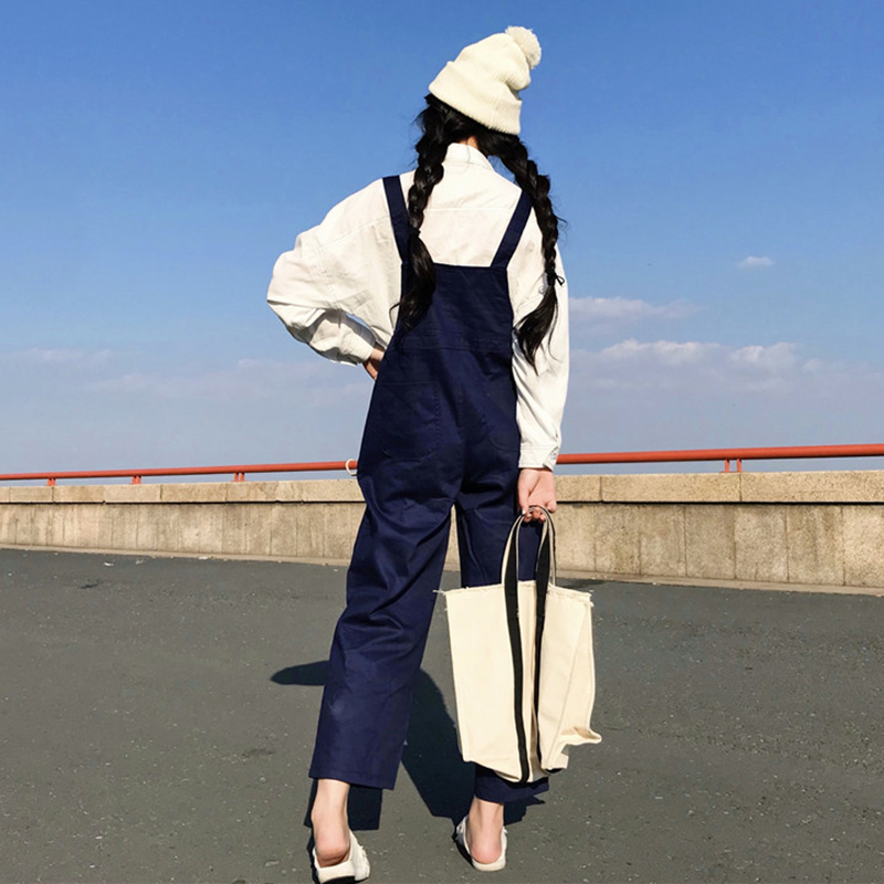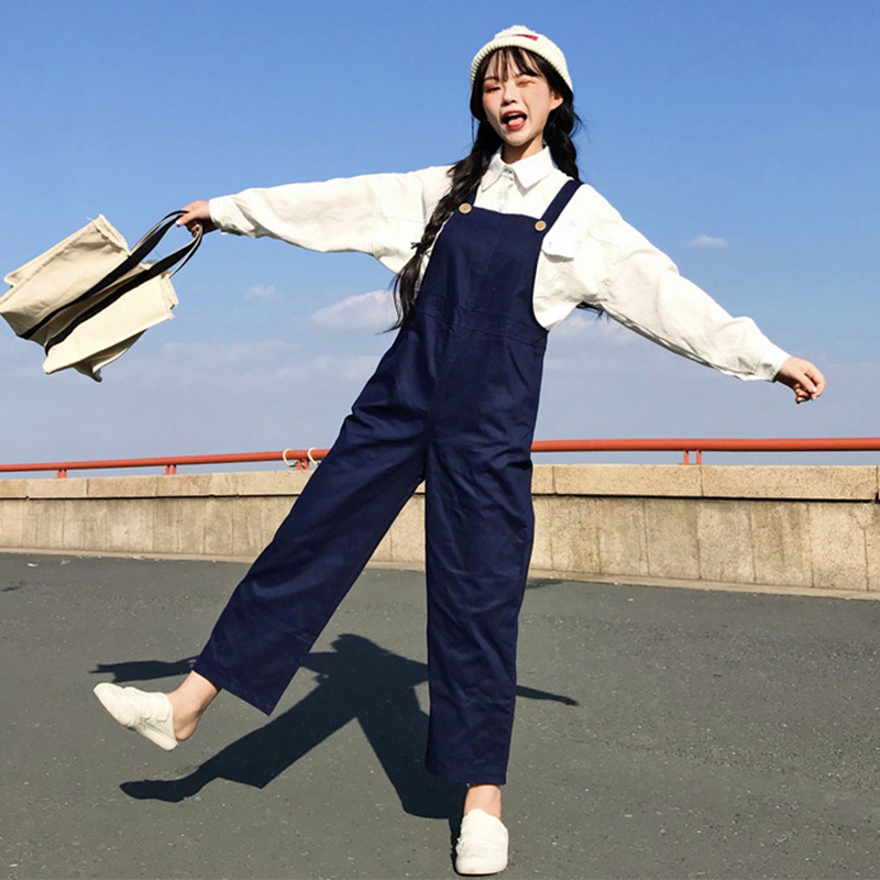 秋冬女裝新款韓版時尚翻領長袖襯衫學生寬松顯瘦背帶長褲子兩件套