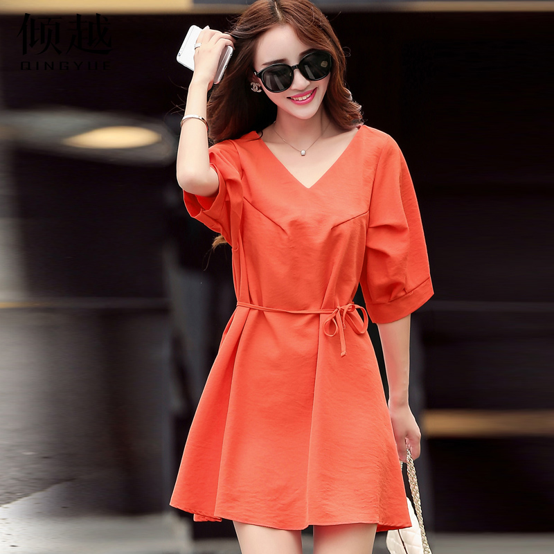 / 傾越2017夏裝新款短袖雪紡V領大碼氣質修身中長款收腰系帶連衣裙