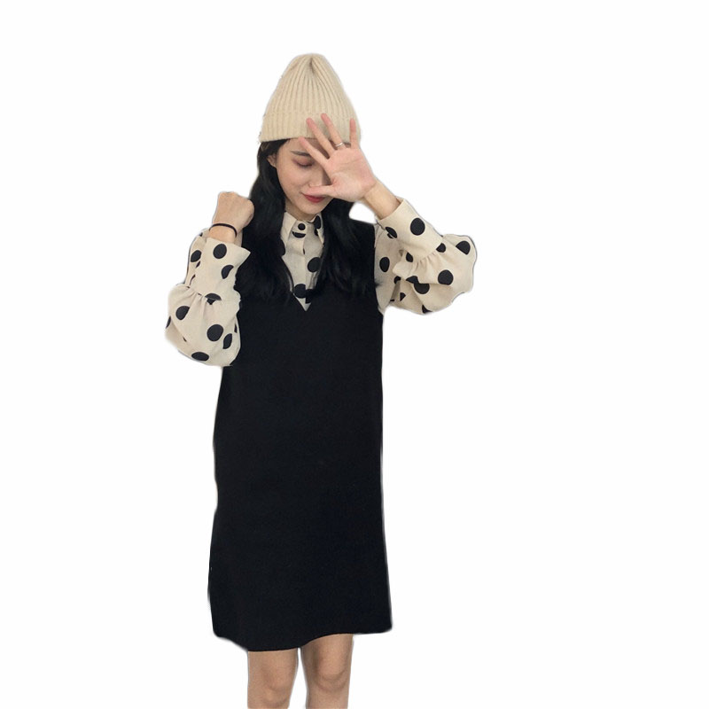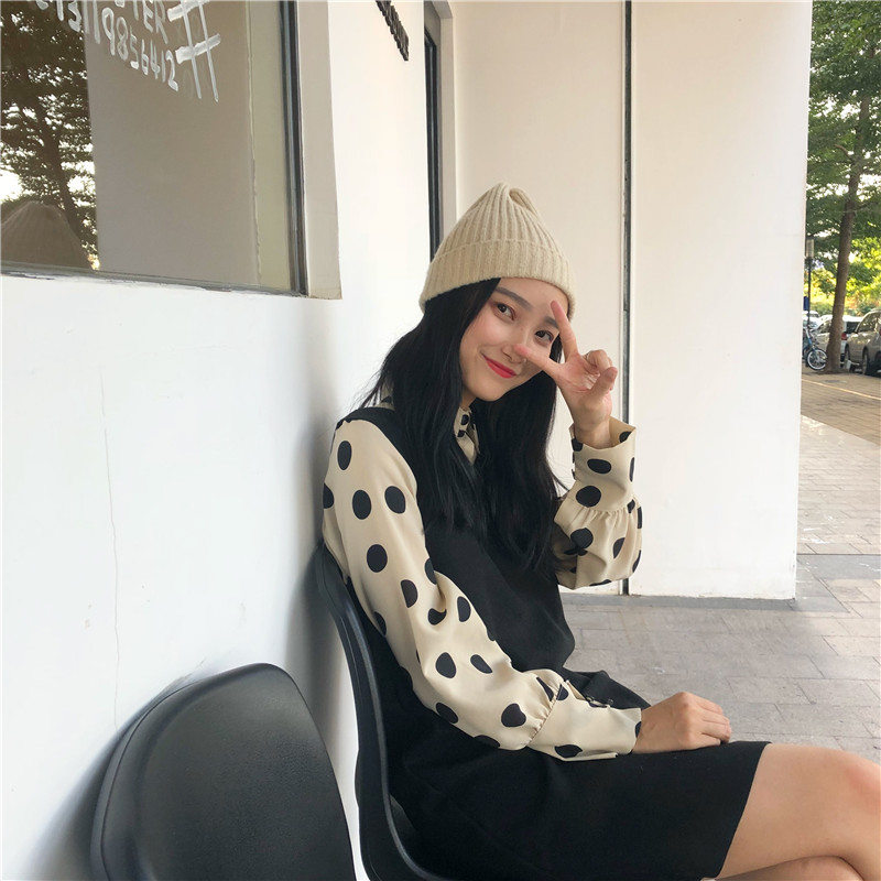 韓版秋裝女2018新款可愛V領針織馬甲女套裝+波點襯衫時尚兩件套潮