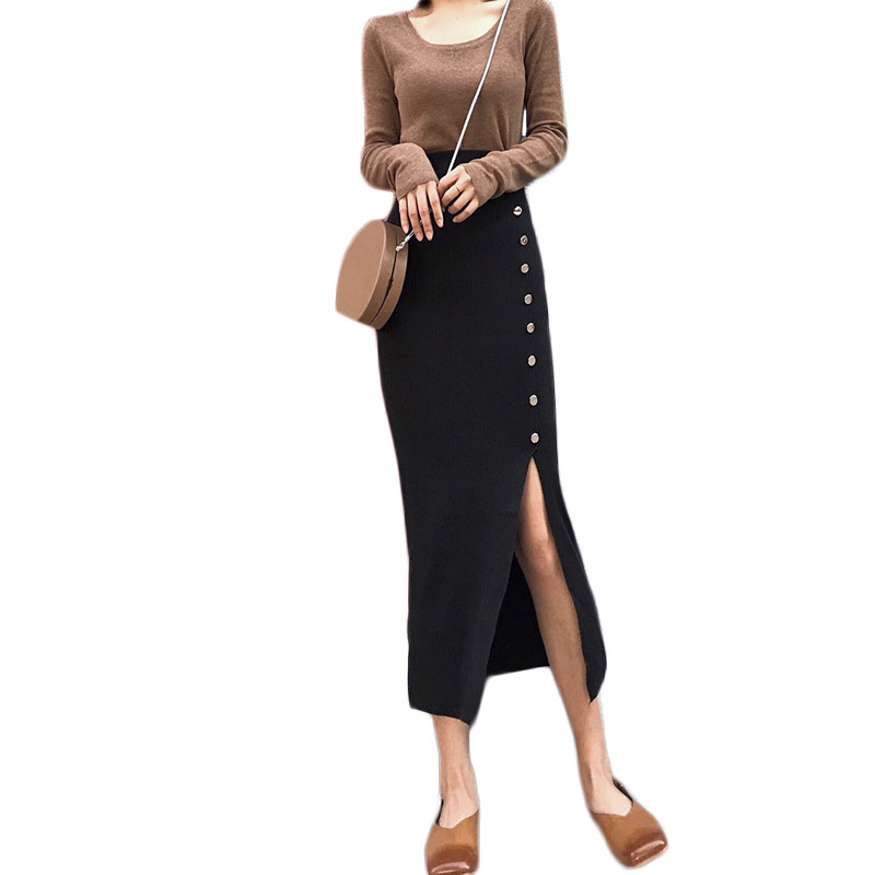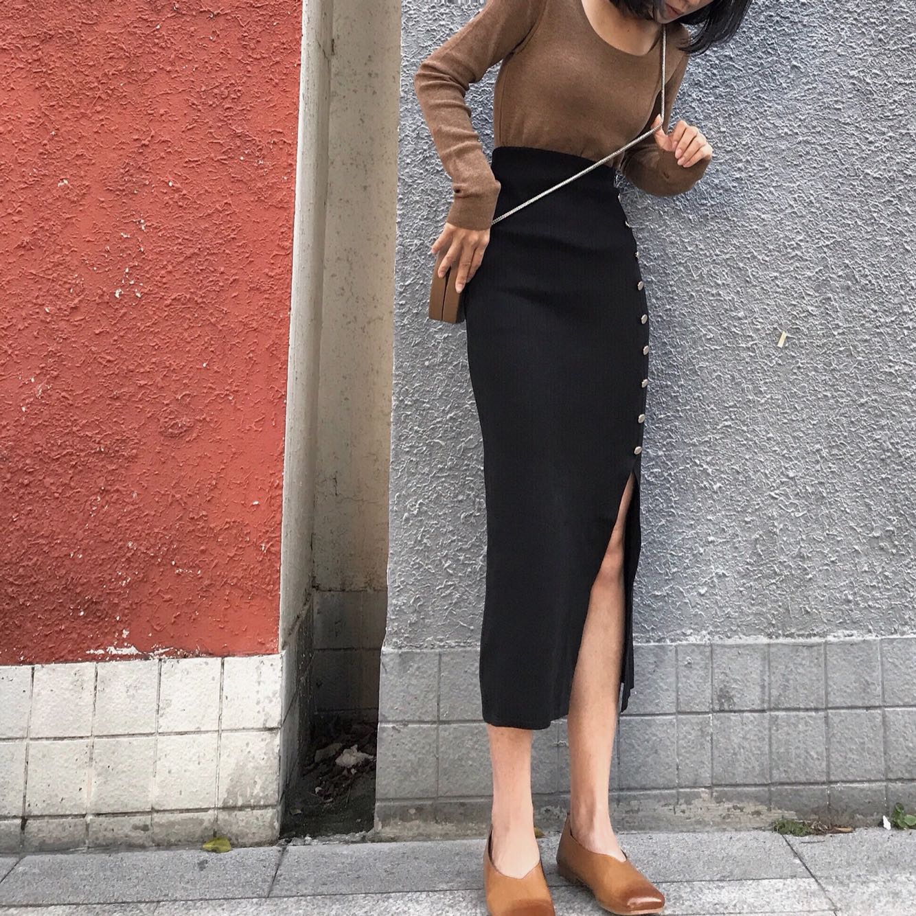 / 半身裙秋女2018新款時尚復古百搭修身顯瘦一排扣針織高腰中長裙潮