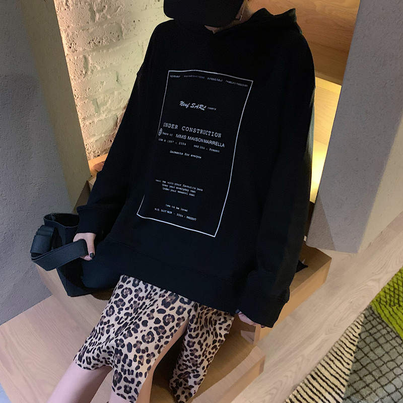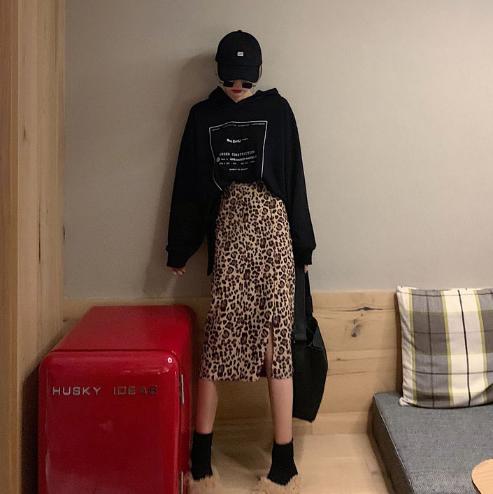 / 女神套裝秋冬新款寬松長袖連帽字母加絨衛衣+高腰開叉豹紋半身裙