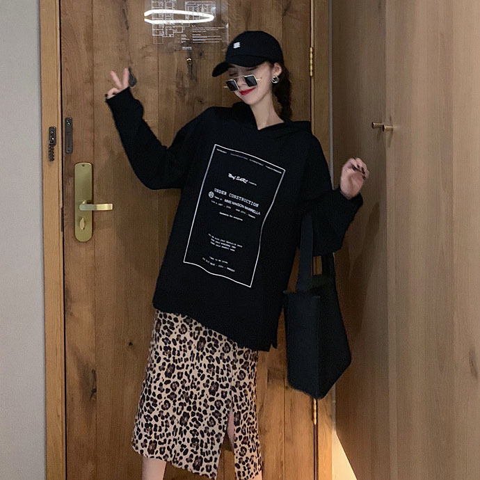 女神套裝秋冬新款寬松長袖連帽字母加絨衛衣+高腰開叉豹紋半身裙