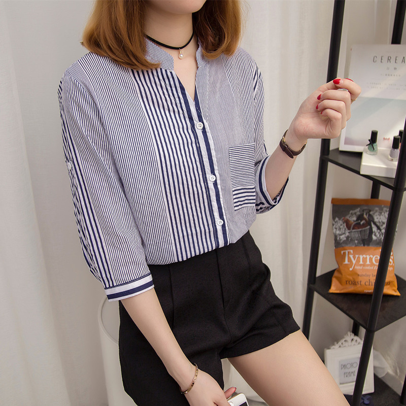 條紋襯衫女甜美上衣小清新韓范半袖不規則格子襯衣女chic襯衫外套