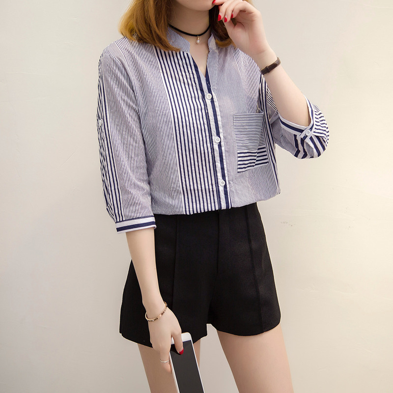 / 條紋襯衫女甜美上衣小清新韓范半袖不規則格子襯衣女chic襯衫外套