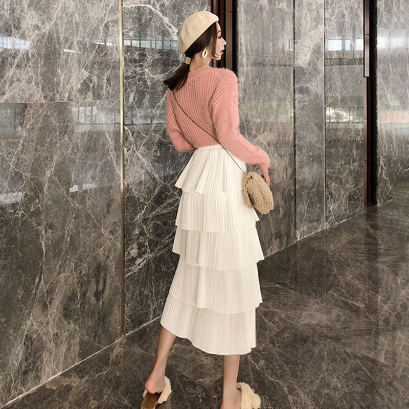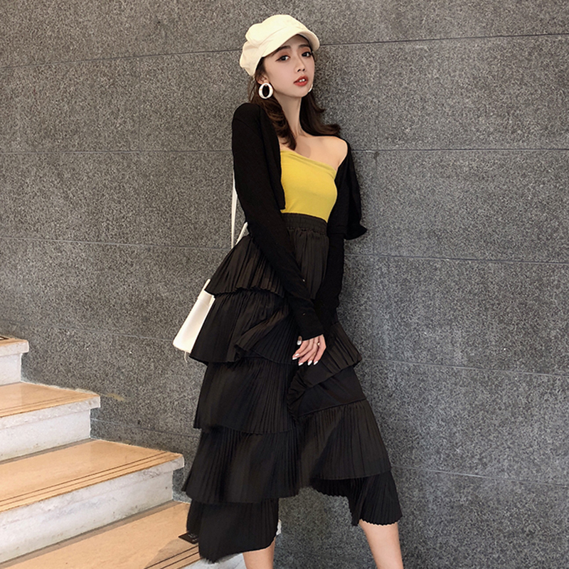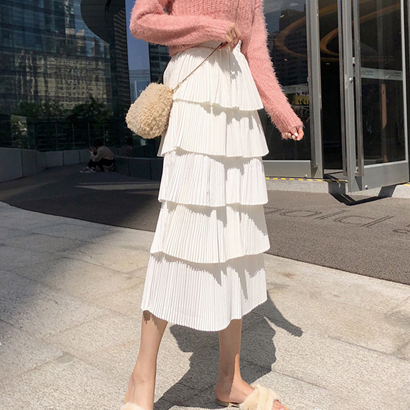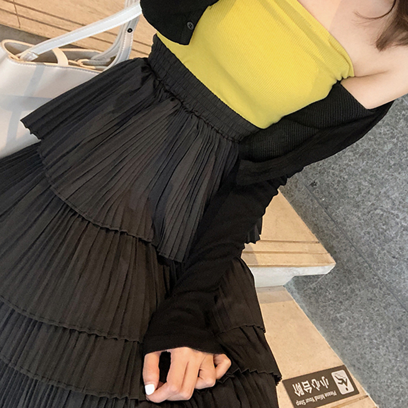 秋冬女裝2018新款復古風高腰顯瘦中長蛋糕裙學生時尚黑色半身裙子