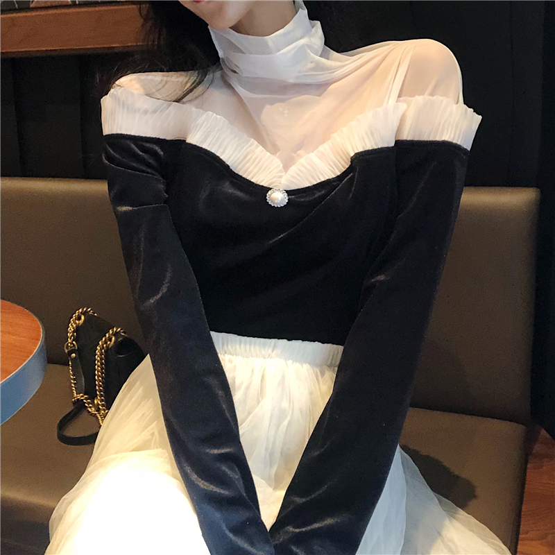 / chic金絲絨高領長袖打底衫女秋冬裝2018新款修身百搭拼接蕾絲上衣
