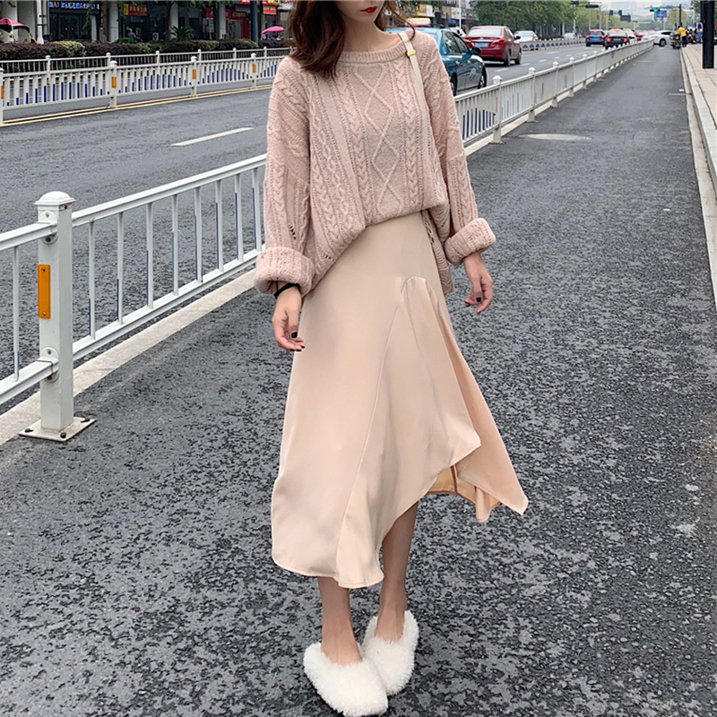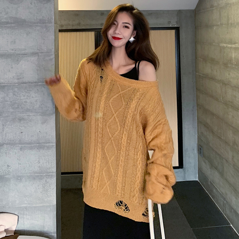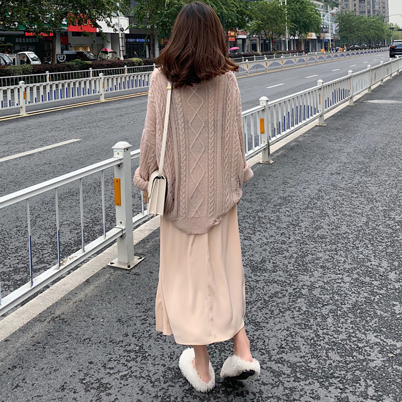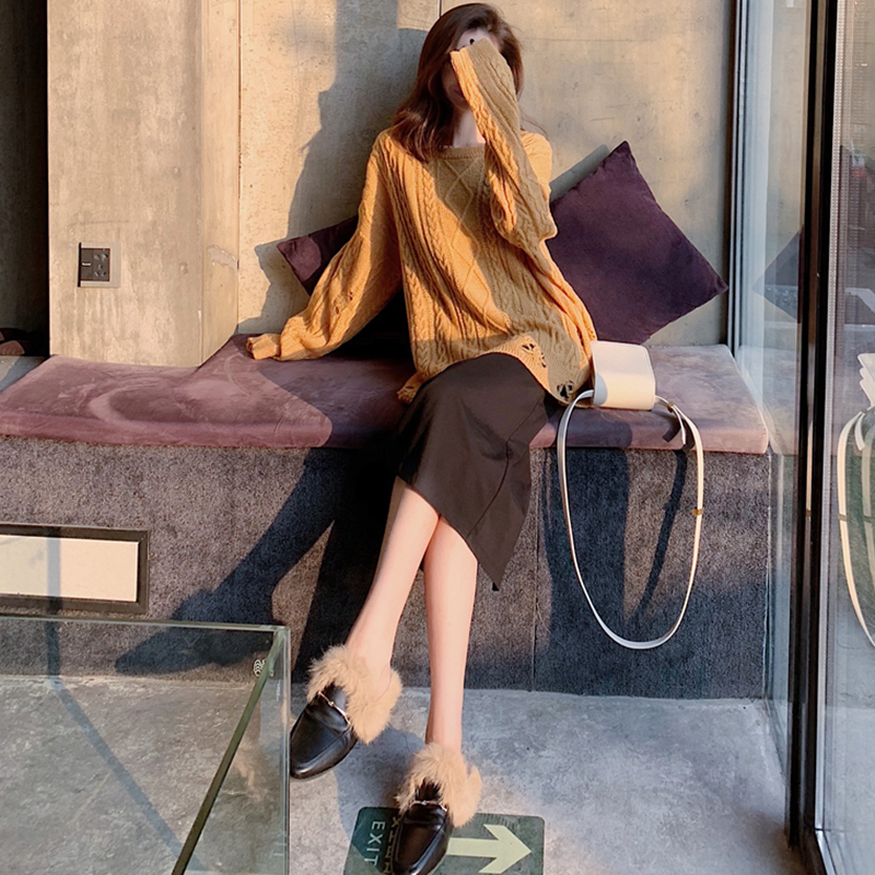 御姐套裝女秋冬新款破洞寬松毛衣針織衫外套高腰顯瘦黑色半身裙子