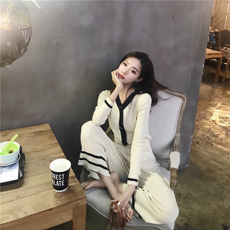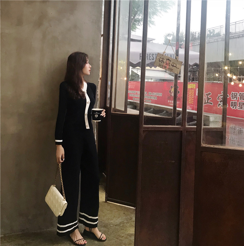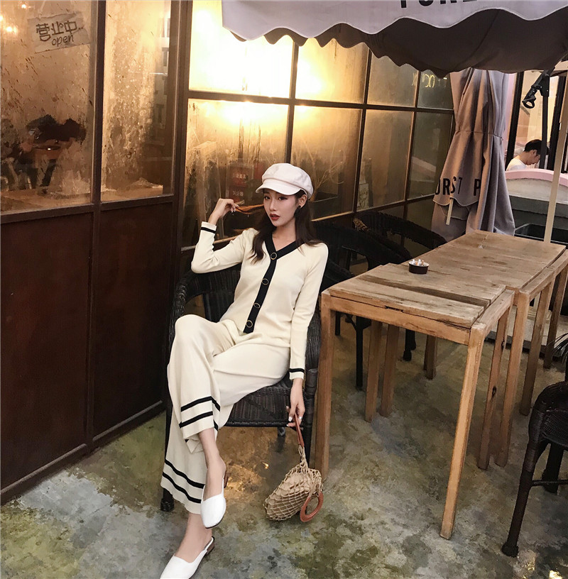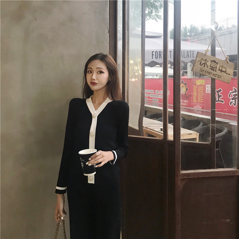 港風新款韓版修身顯瘦撞色V領針織上衣高腰闊腿褲兩件套時尚套裝