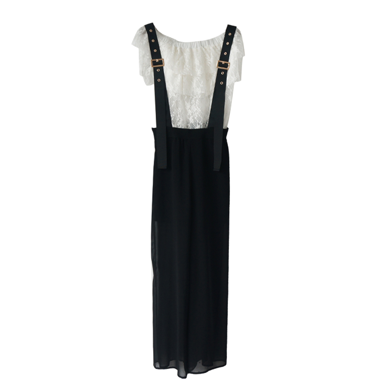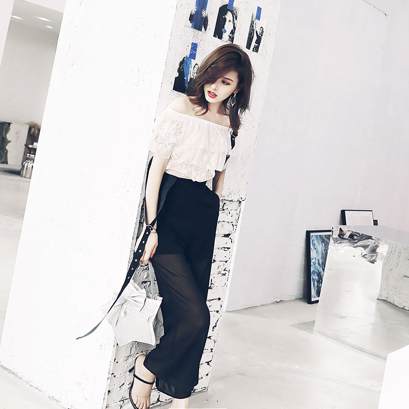 / 名媛氣質小心機一字領露肩上衣蕾絲衫時髦套裝女背帶闊腿褲兩件套