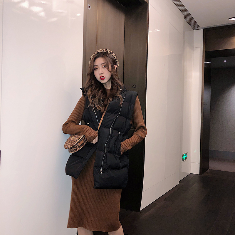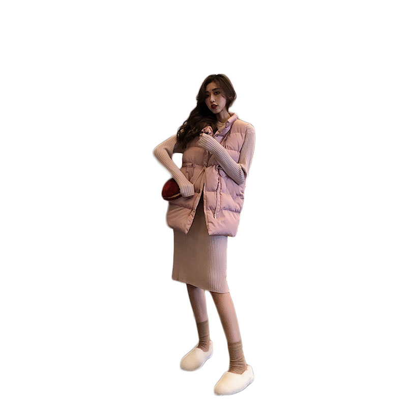 套頭修身坑條長袖針織連衣裙+面包服無袖馬甲外套女時尚兩件套裝