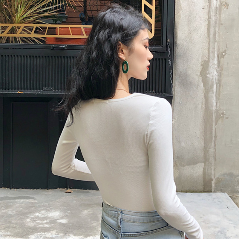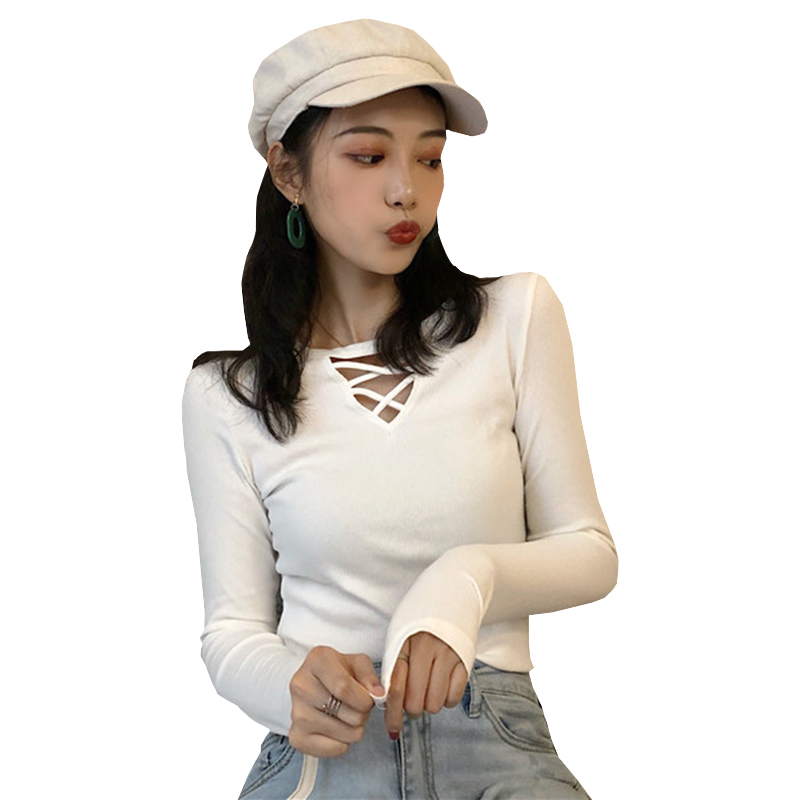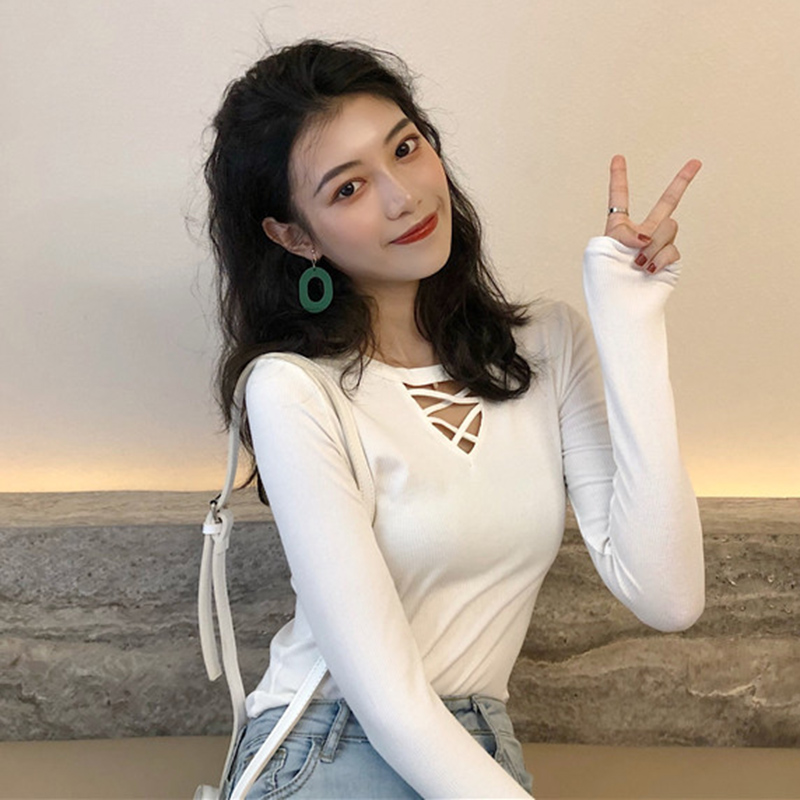 女裝韓版港味心機V領長袖交叉鏤空t恤上衣秋裝新款修身顯瘦打底衫