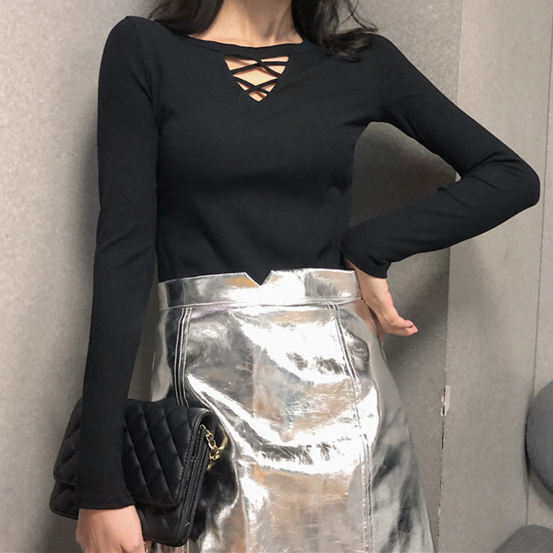/ 女裝韓版港味心機V領長袖交叉鏤空t恤上衣秋裝新款修身顯瘦打底衫