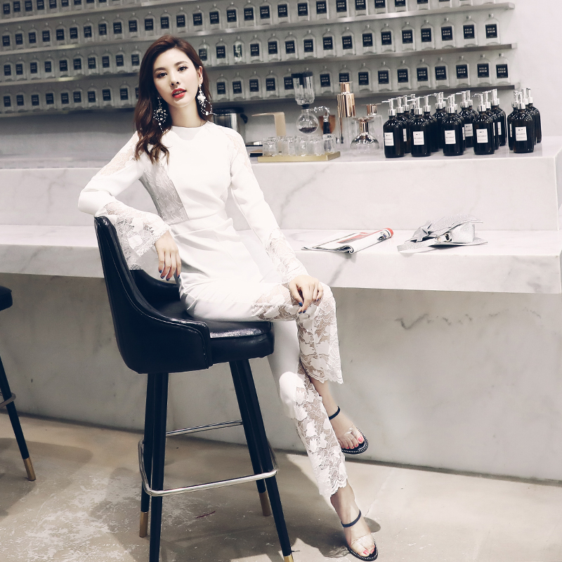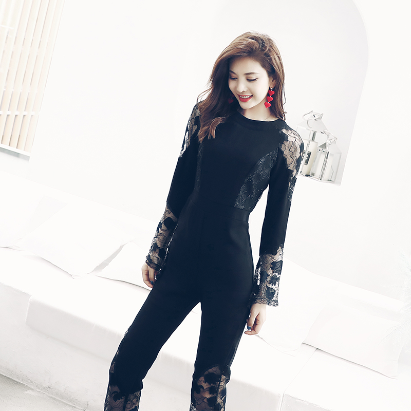 女神范時尚名媛氣質女夏2018秋裝新款高腰蕾絲拼接顯瘦連體褲子