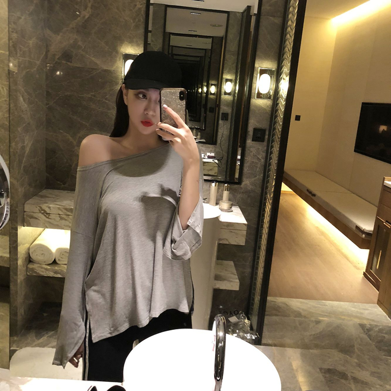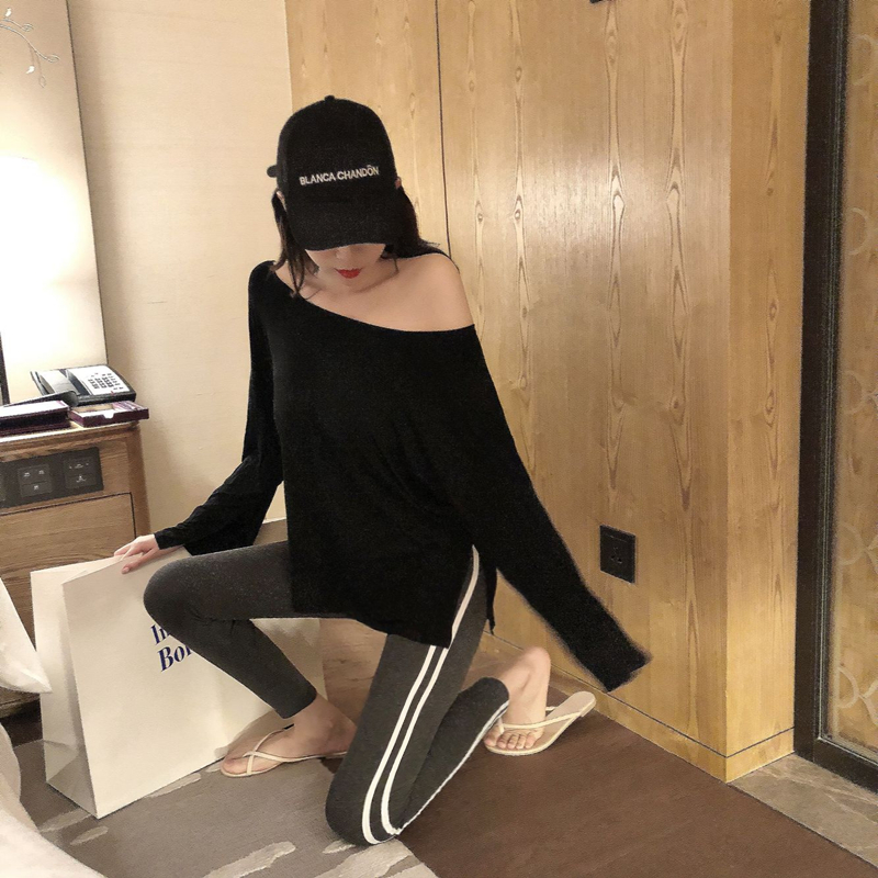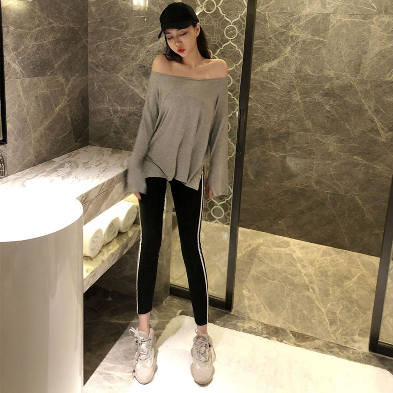 / 韓版套裝上衣露肩性感寬松長袖開叉t+側邊兩條白杠修身打底褲潮