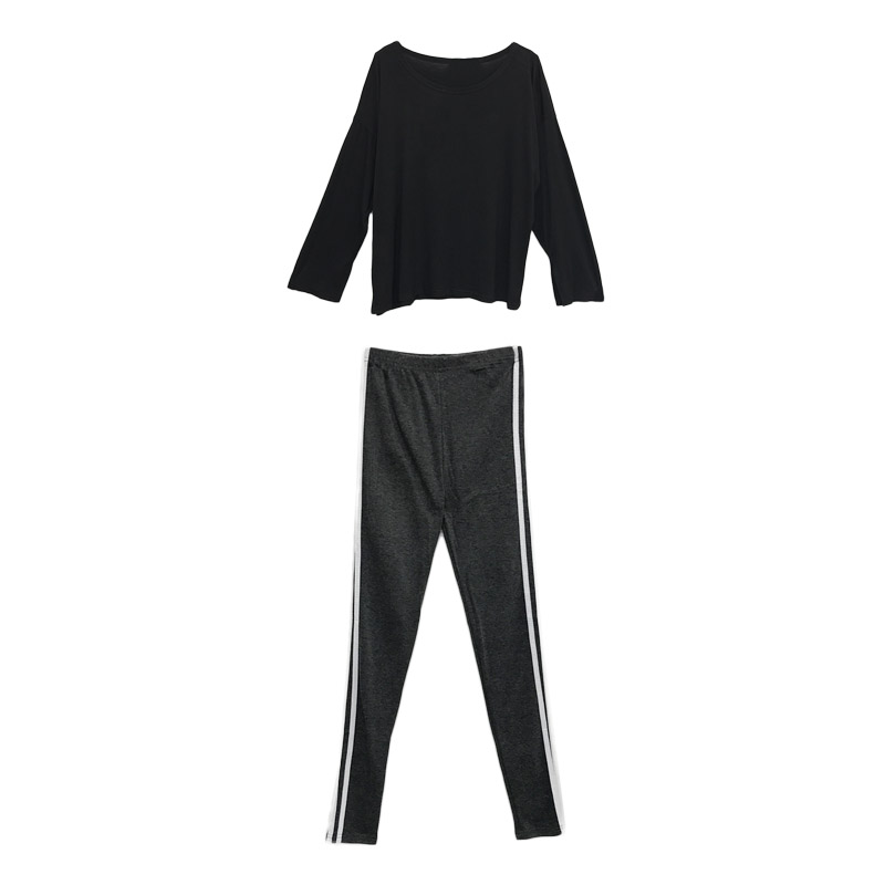 韓版套裝上衣露肩性感寬松長袖開叉t+側邊兩條白杠修身打底褲潮