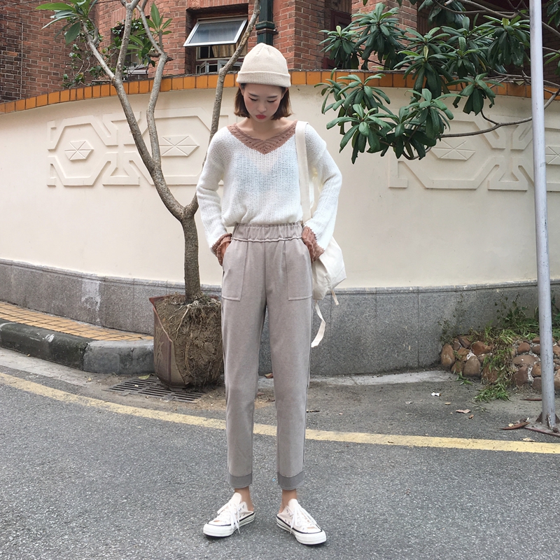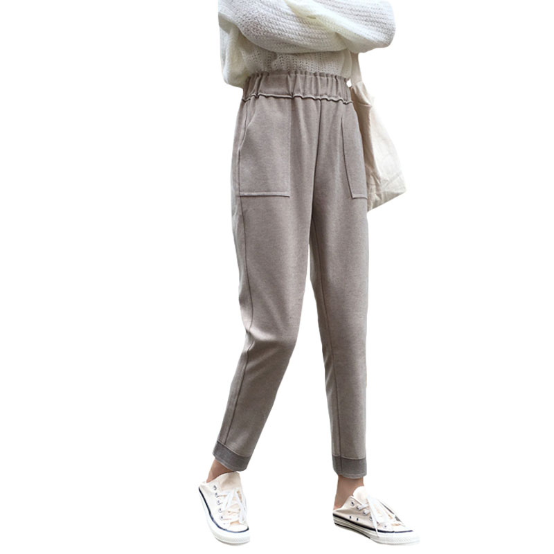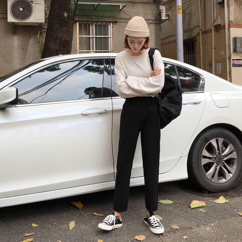 / 秋季韓版松緊腰寬松呢子哈倫褲高腰休閑褲直筒褲九分褲學生褲子女