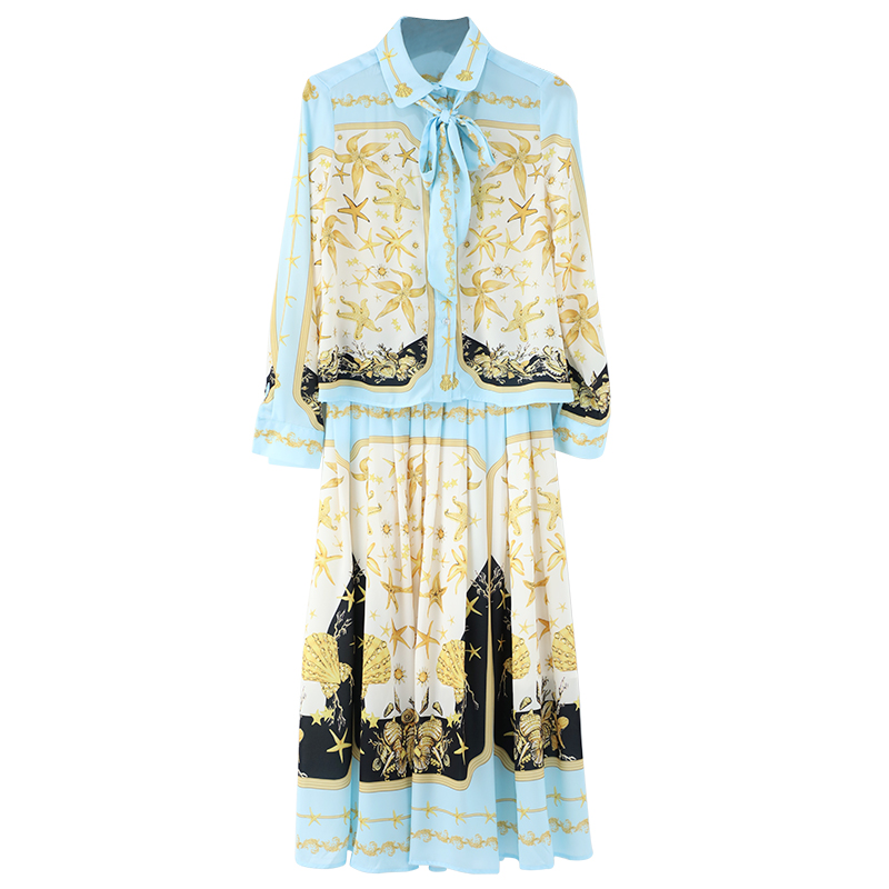 / 名媛氣質套裝裙秋季2018新款襯衫上衣印花半身百褶裙兩件套連衣裙
