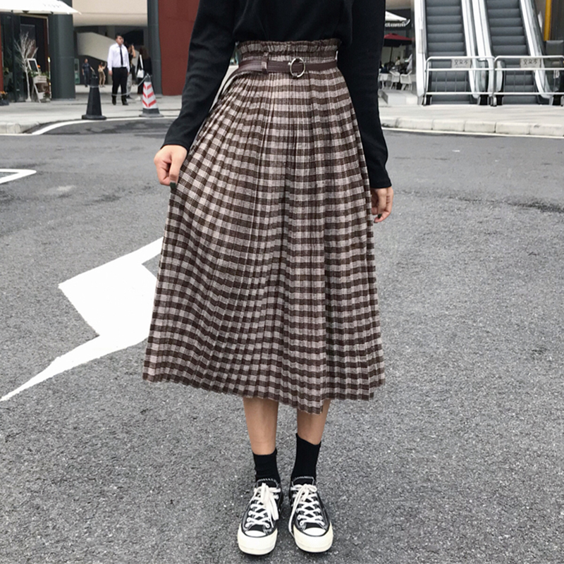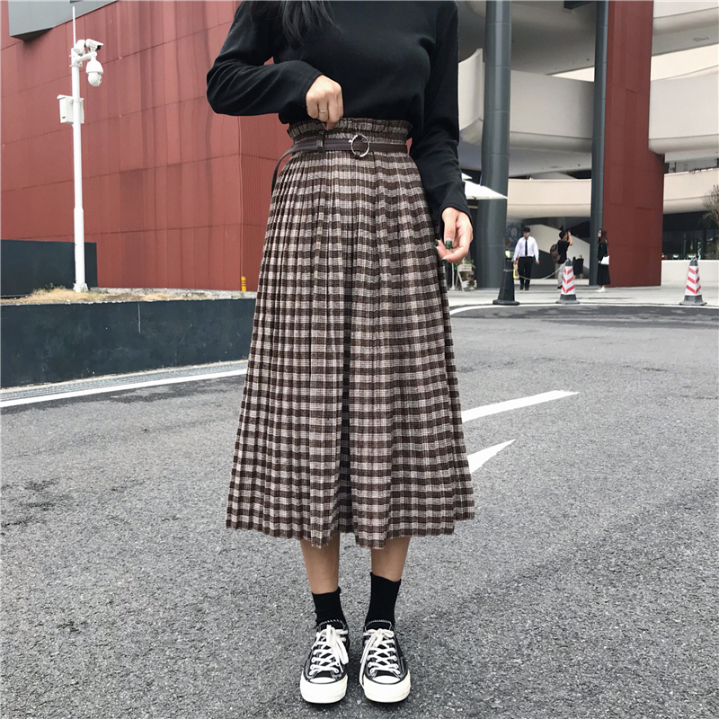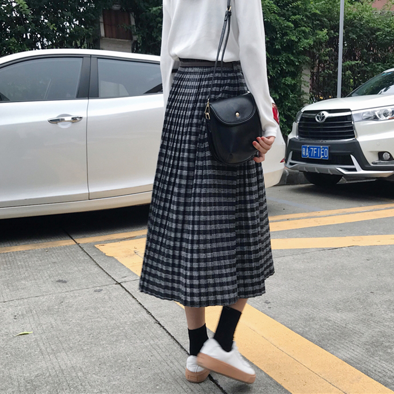 中長款毛呢復古格子半身裙女秋冬裝2018新款韓版高腰a字百褶裙子