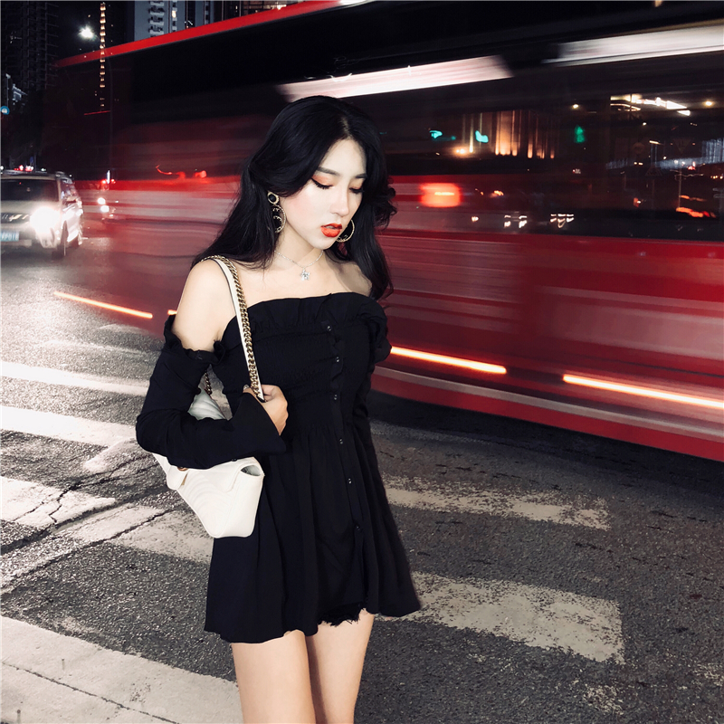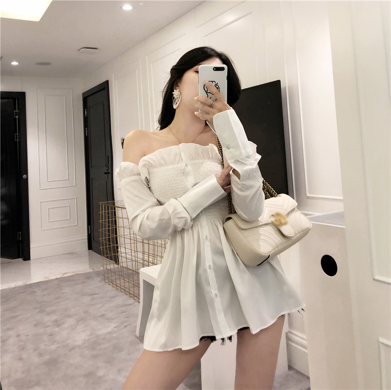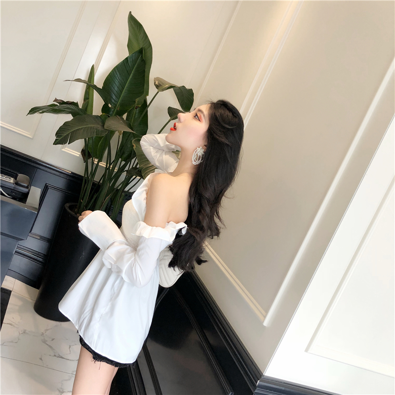/ 韓版時尚百搭chic早秋上衣慵懶一字肩收腰修身顯瘦露背長袖襯衣潮