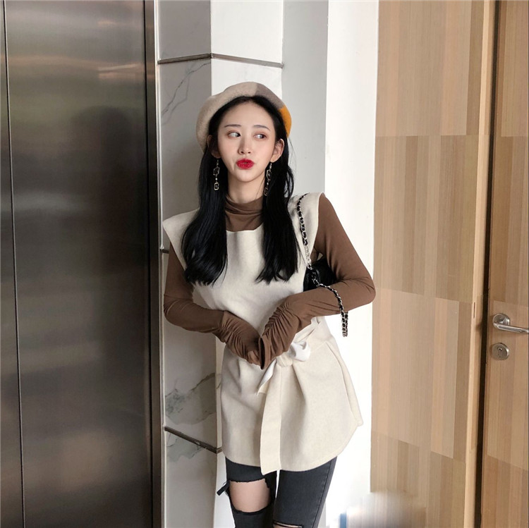 / 2018秋裝新款韓版chic時尚兩件套百搭高領打底衫系帶無袖背心套裝