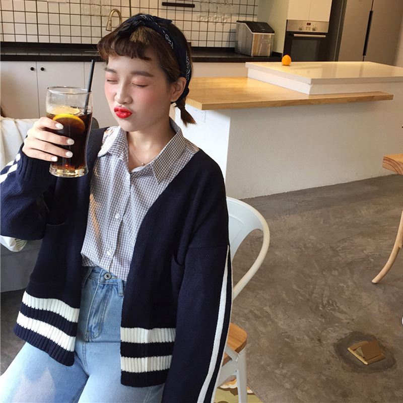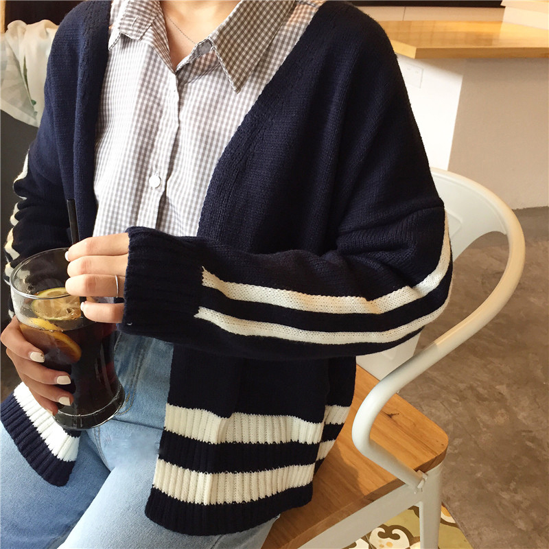 / 時尚撞色條紋針織上衣秋裝韓版寬松慵懶風毛衣女新款休閑開衫外套