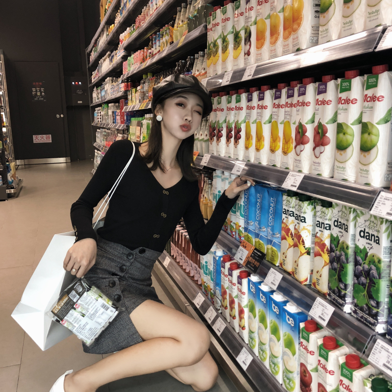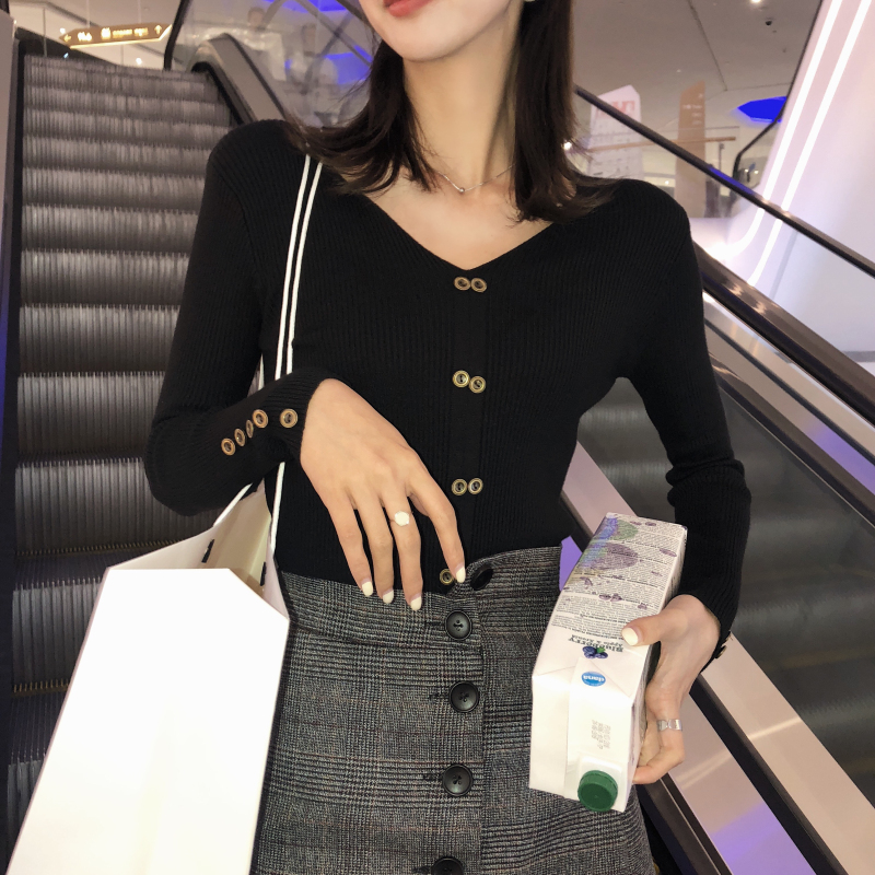 新款韓版復古chic純色修身V領雙排鈕扣針織衫彈力套頭毛衣女上衣