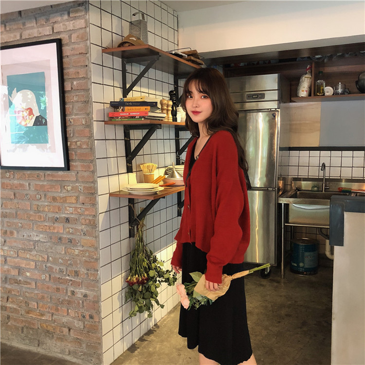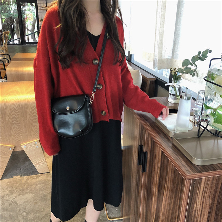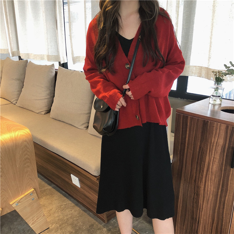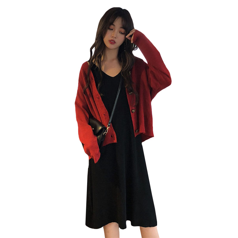 / 韓版時尚休閑女神套裝秋季毛衣開衫外套+針織背心連衣裙兩件套女