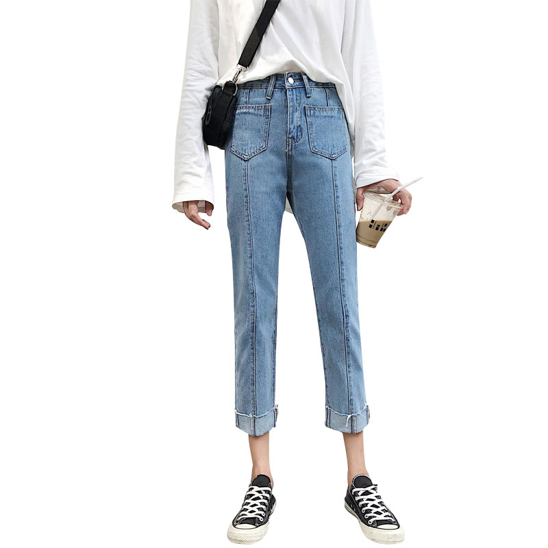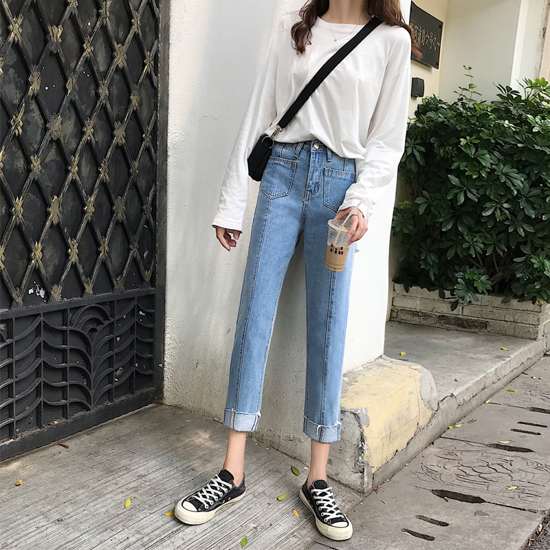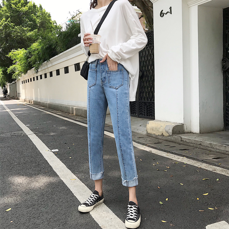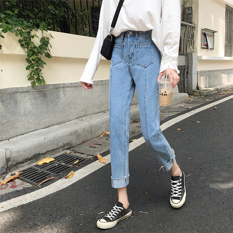 / 秋季女裝韓版水洗寬松百搭牛仔褲高腰顯瘦學生直筒褲小腳褲九分褲