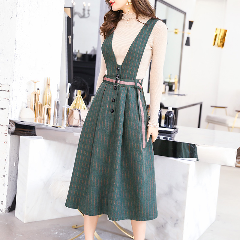 / 針織連衣裙秋裝女2018新款毛衣配背帶裙子兩件套裝秋冬季收腰長裙