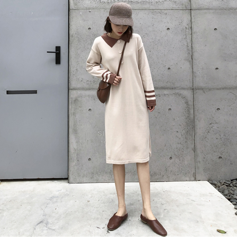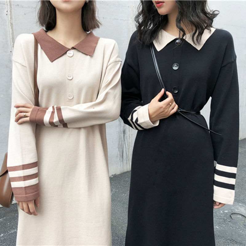 / 拼色翻領針織開叉中長連衣裙子女秋冬裝新款學生egg風法式桔梗裙
