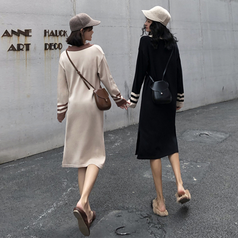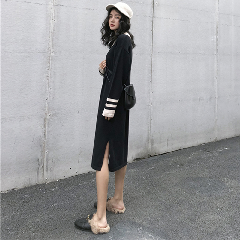 拼色翻領針織開叉中長連衣裙子女秋冬裝新款學生egg風法式桔梗裙