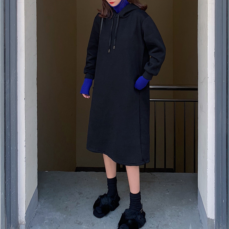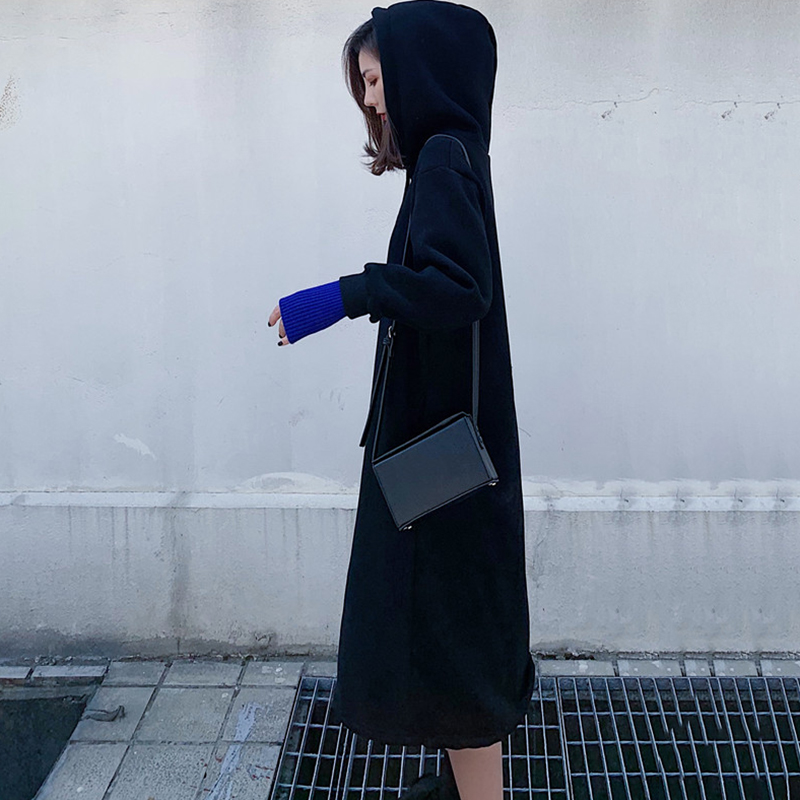 / 假兩件長款加絨衛衣2018新款女秋冬裝港風黑色連帽外套長袖上衣潮