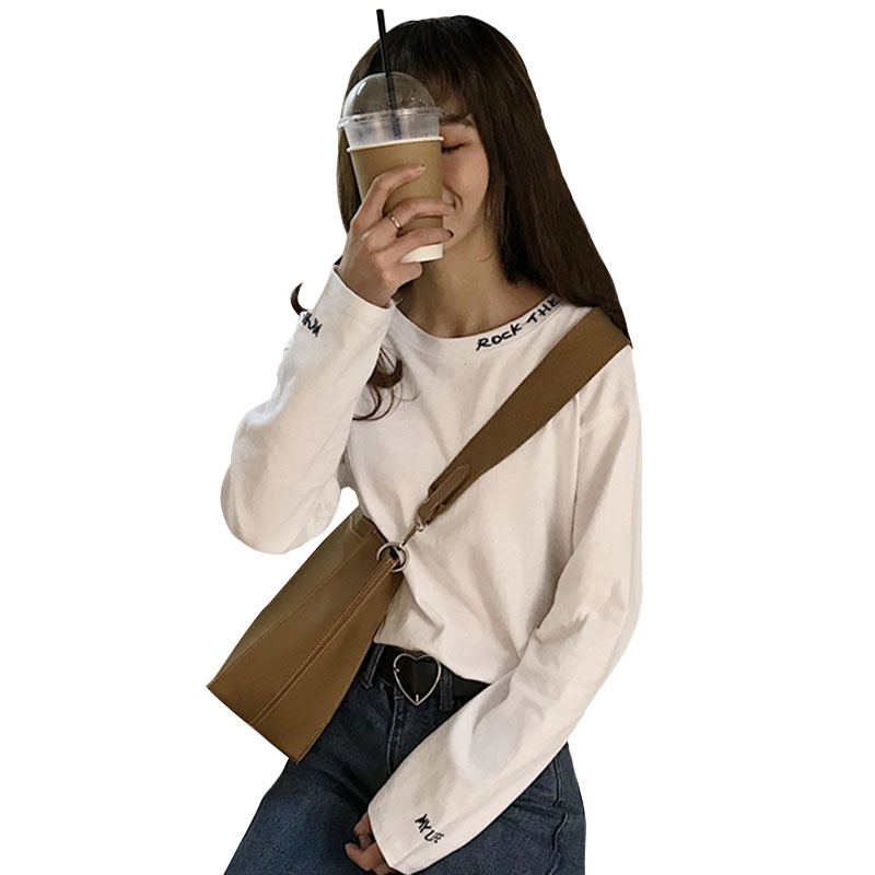 秋裝女裝韓版寬松復古簡約字母刺繡長袖純棉T恤學生上衣打底衫潮