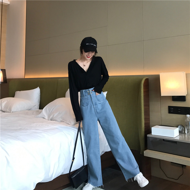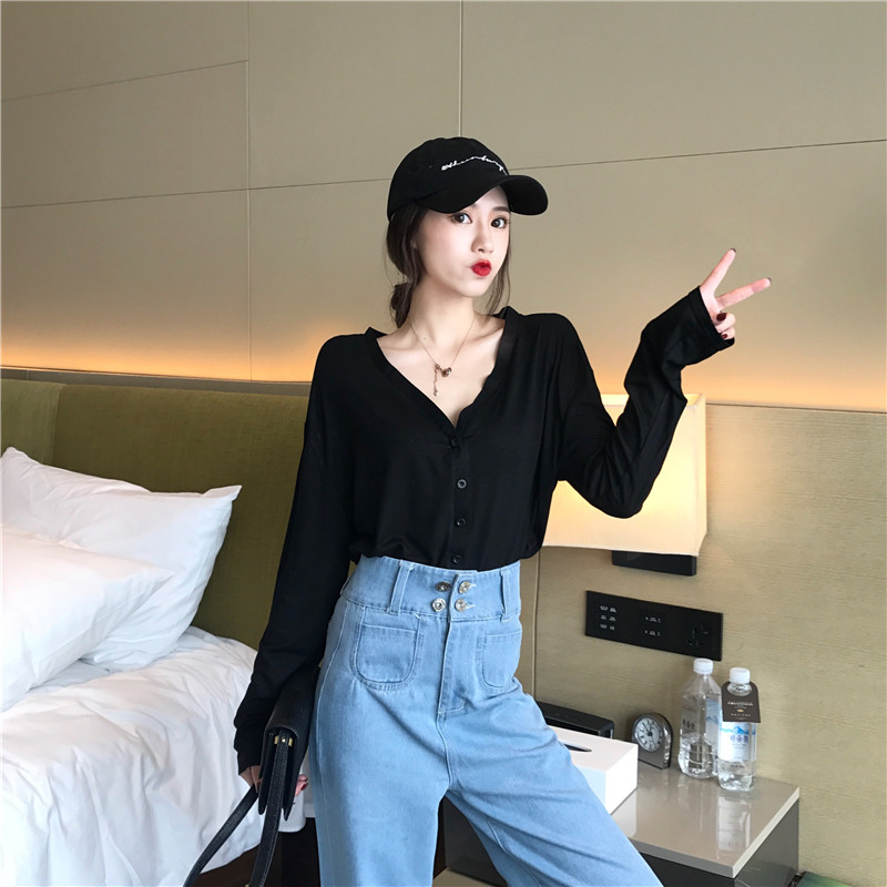 韓國復古風女神套裝秋寬松V領長袖百搭打底衫+高腰排扣牛仔闊腿褲