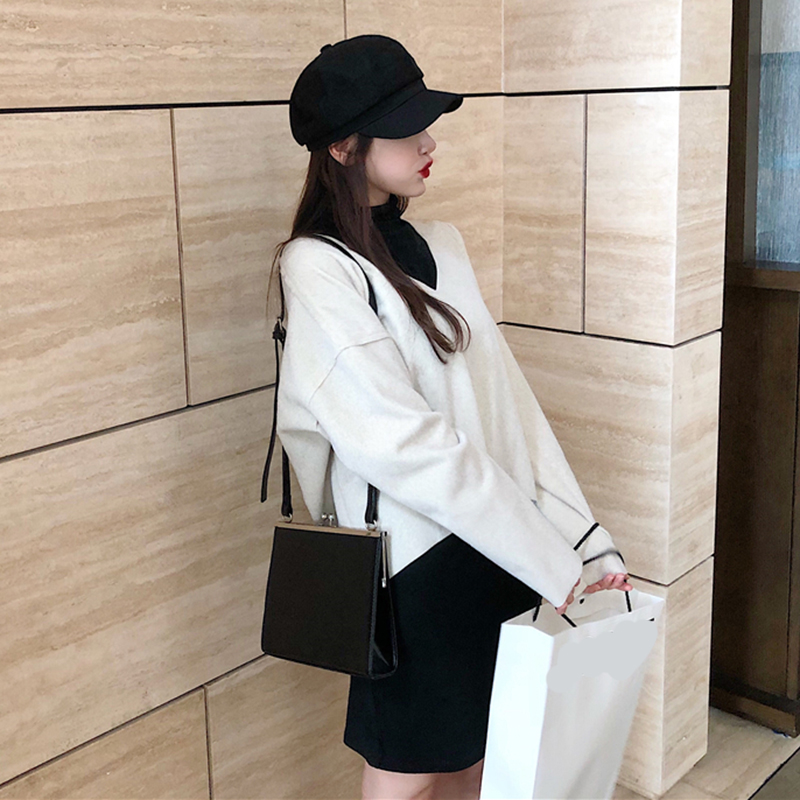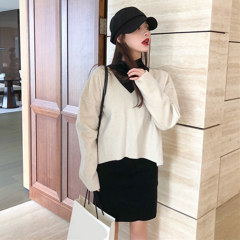 / 氣質女神兩件套秋冬新款毛呢寬松V領套頭上衣修身高領彈力連衣裙