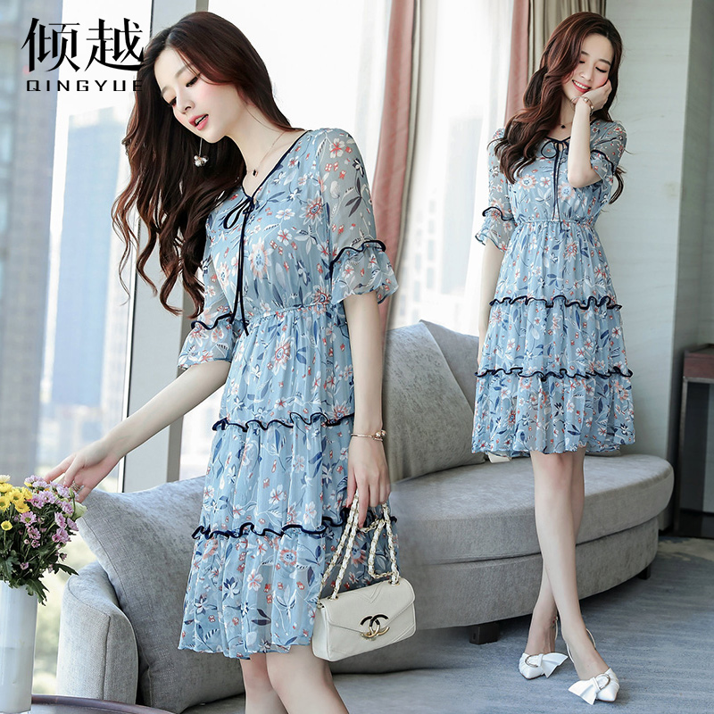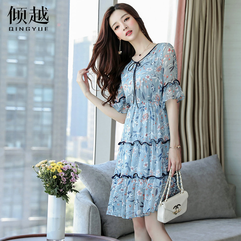 雪紡連衣裙2017夏季新款女裝中袖系帶拼接碎花氣質小清新印花長裙