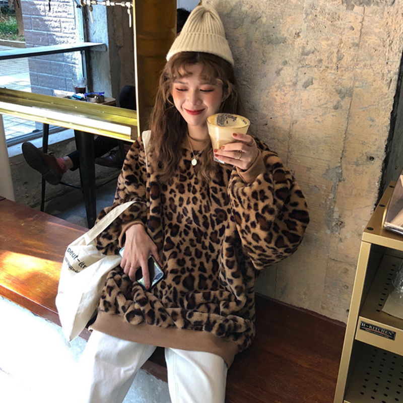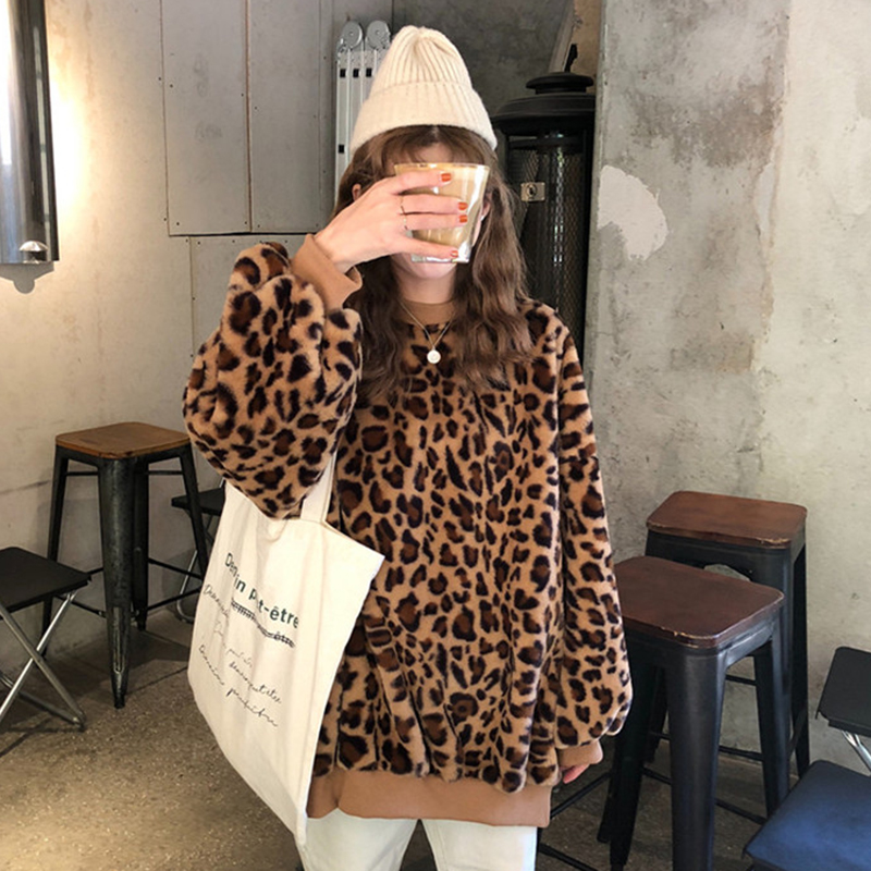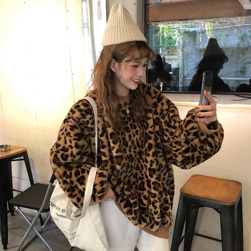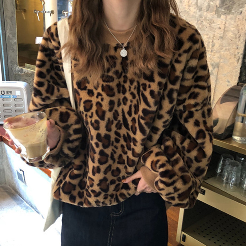 寬松毛絨外套秋冬女裝2018新款韓版豹紋時尚衛衣絨衫學生休閑上衣