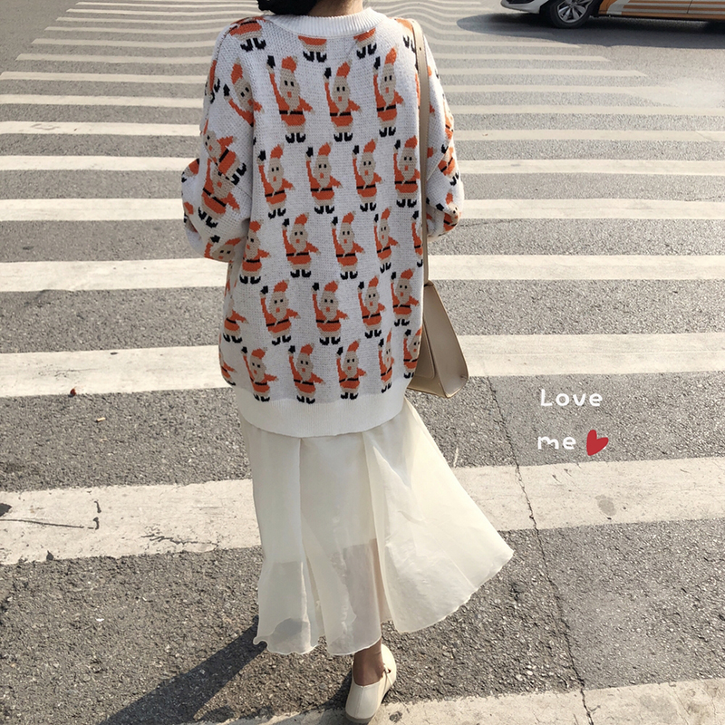 港味chic圣誕老人寬松長袖套頭毛衣女冬裝2018新款寬松針織衫外套