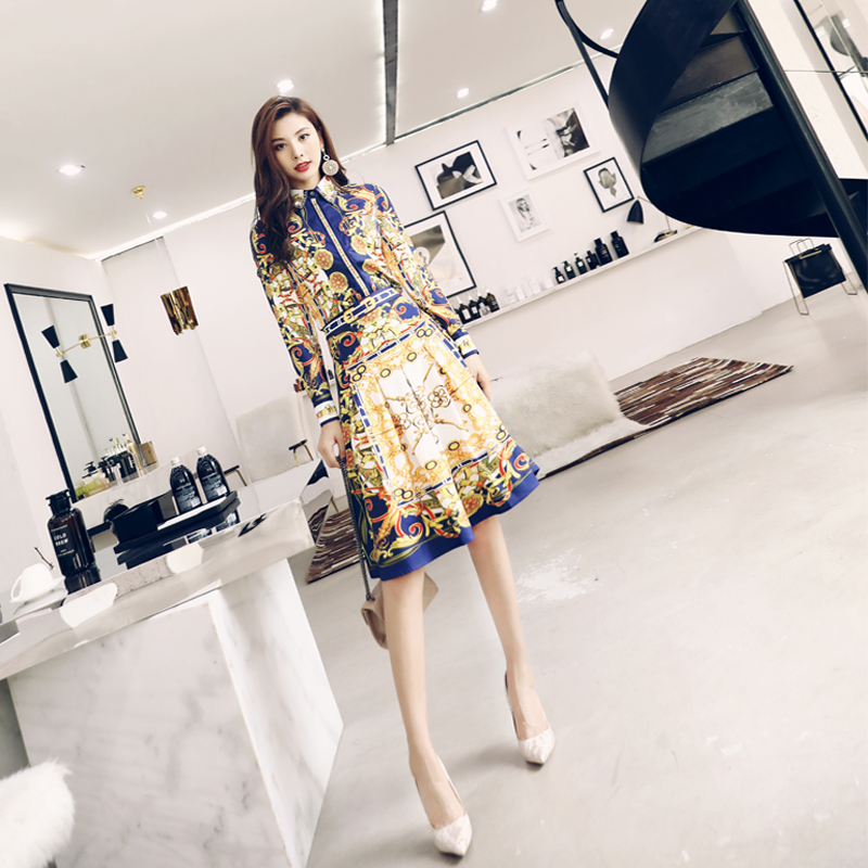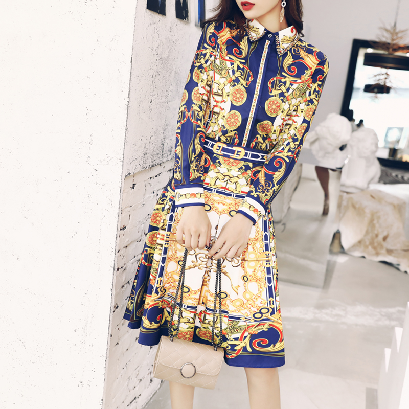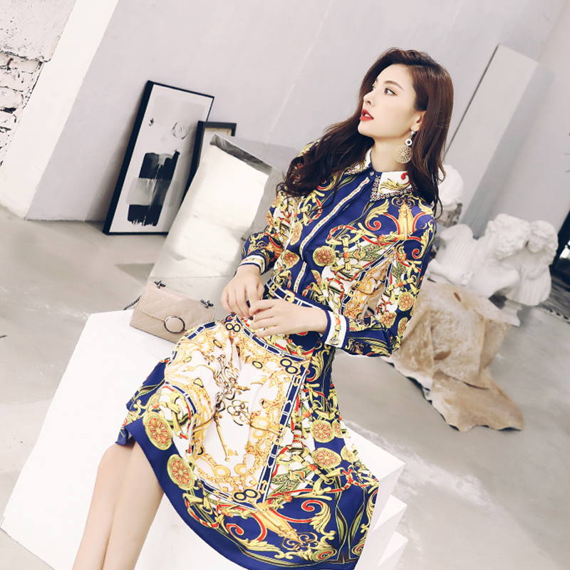/ 名媛氣質2018秋季女套裝新款長袖印花襯衫高腰修身百褶半裙兩件套
