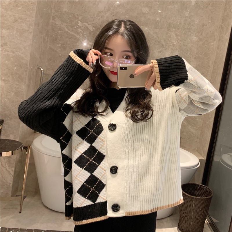 / 撞色格子慵懶風寬松網紅毛衣女2018新款復古韓版時尚針織開衫外套